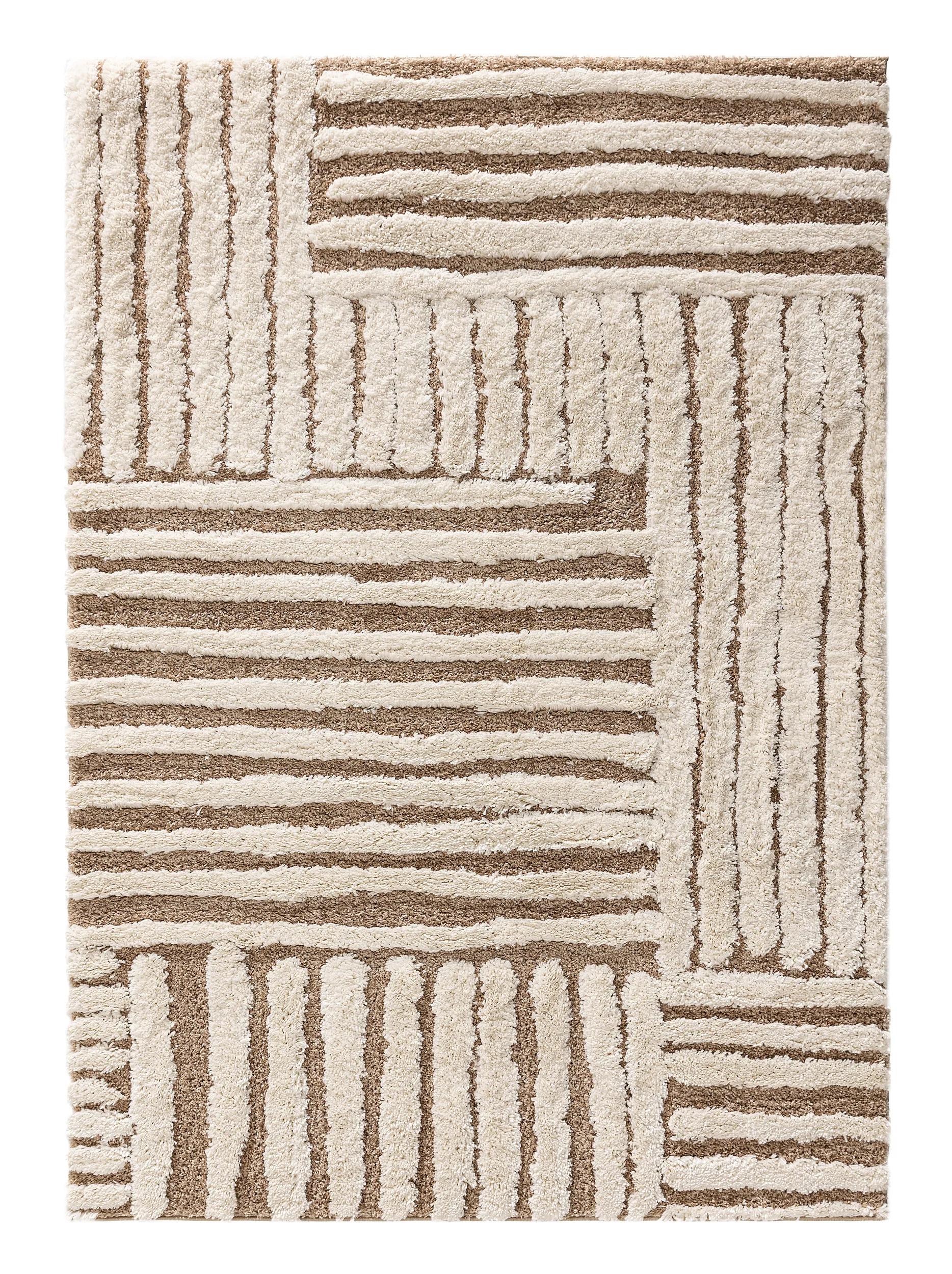 Pensé comme une pièce de design contemporaine, ce tapis affirme une conception artistique où le motif rayé se transforme en langage plastique. Les bandes en crème et beige jouent avec la lumière pour créer un travail des formes subtil, où le jeu des courbes et des lignes fluides dialogue avec des aplats de couleur, instillant une modernité élégante qui redéfinit l'espace sans ostentation.