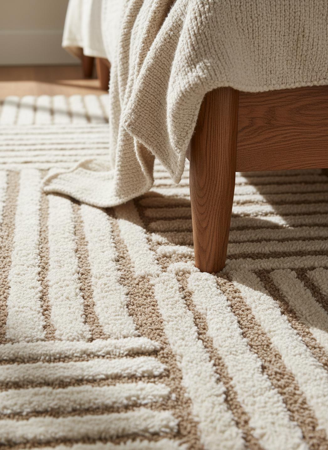 Sous les pas, la douceur se révèle immédiatement grâce à une densité maîtrisée et une surface équilibrée qui offre un toucher moderne, accueillant et précis. La sensation de confort se combine à une tenue minutieuse, pensée pour garantir la tenue des couleurs et une longévité visuelle; l'entretien reste simple et discret, limité à une aspiration douce pour préserver la fibre et l'intensité des rayures.