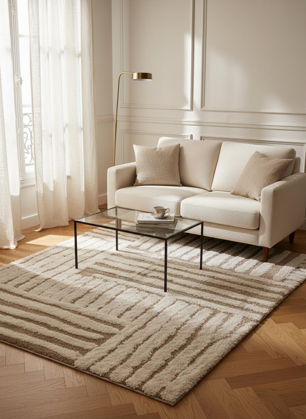 Dans un salon contemporain, une chambre graphique ou une entrée stylisée, il agit comme un catalyseur atmosphérique, capable de transformer une pièce en scène. L'effet sculptural modère les proportions, équilibre meubles et volumes, et redonne perspective à un coin lecture ou à un grand canapé. La modernité élégante de ses rayures invite à la contemplation tout en structurant l'espace.