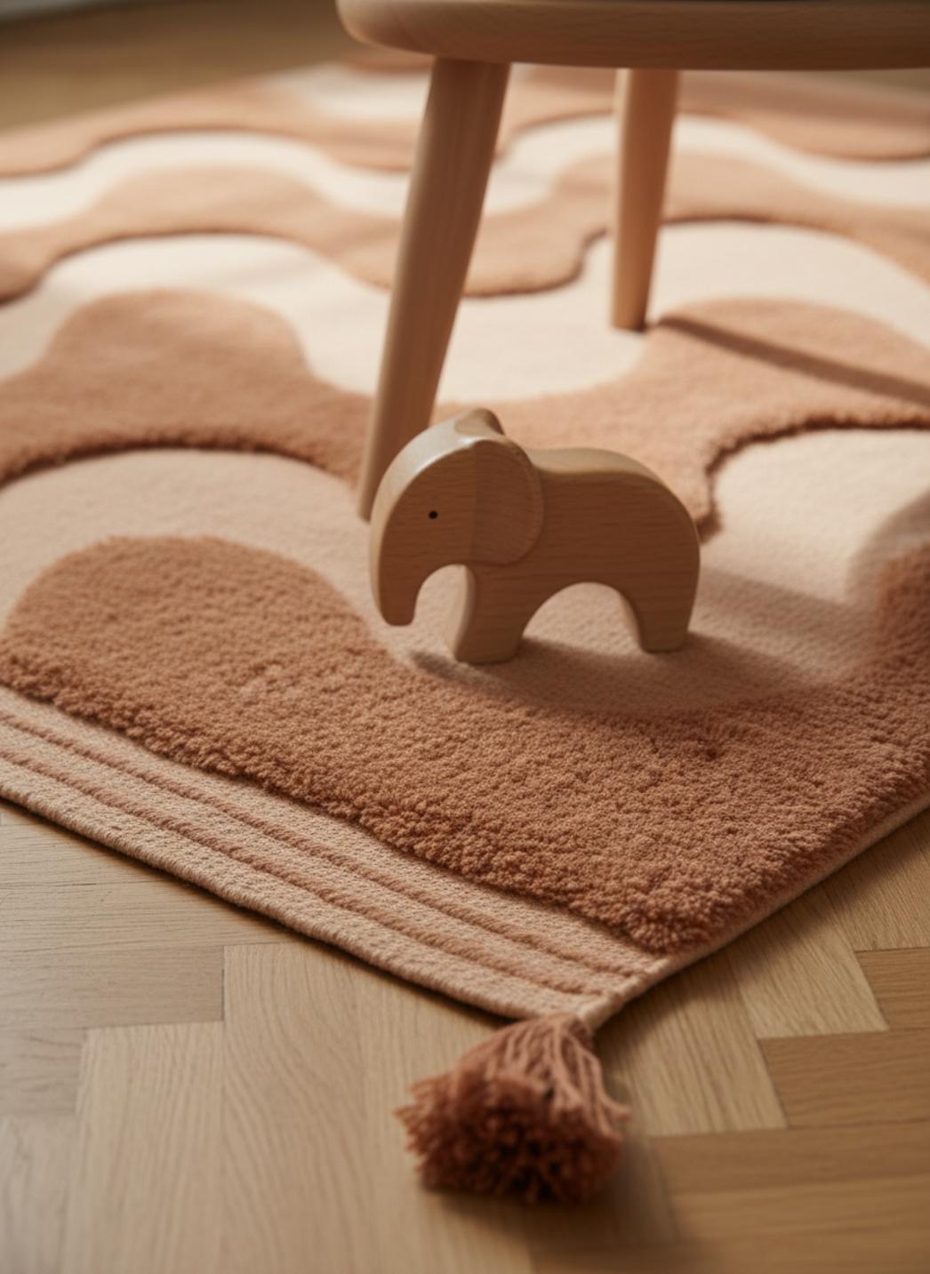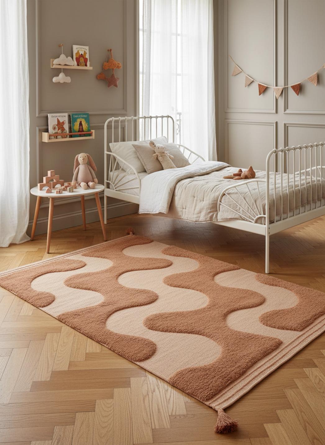 Quand vous posez ce tapis au sol, la chambre se transforme en un écrin où chaque moment devient une petite aventure: les après-midis de jeux, les lectures à deux luminosités et les siestes improvisées. Sa couleur chaude évoque une pierre brûlante au coucher du soleil, une nuance terracotta qui enveloppe l'espace de tendresse et invite au calme.
