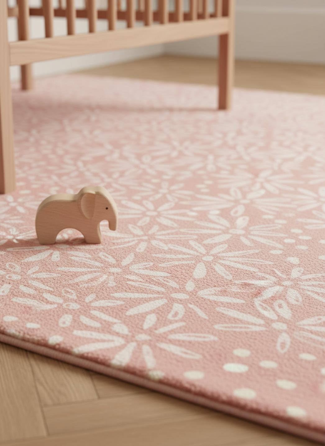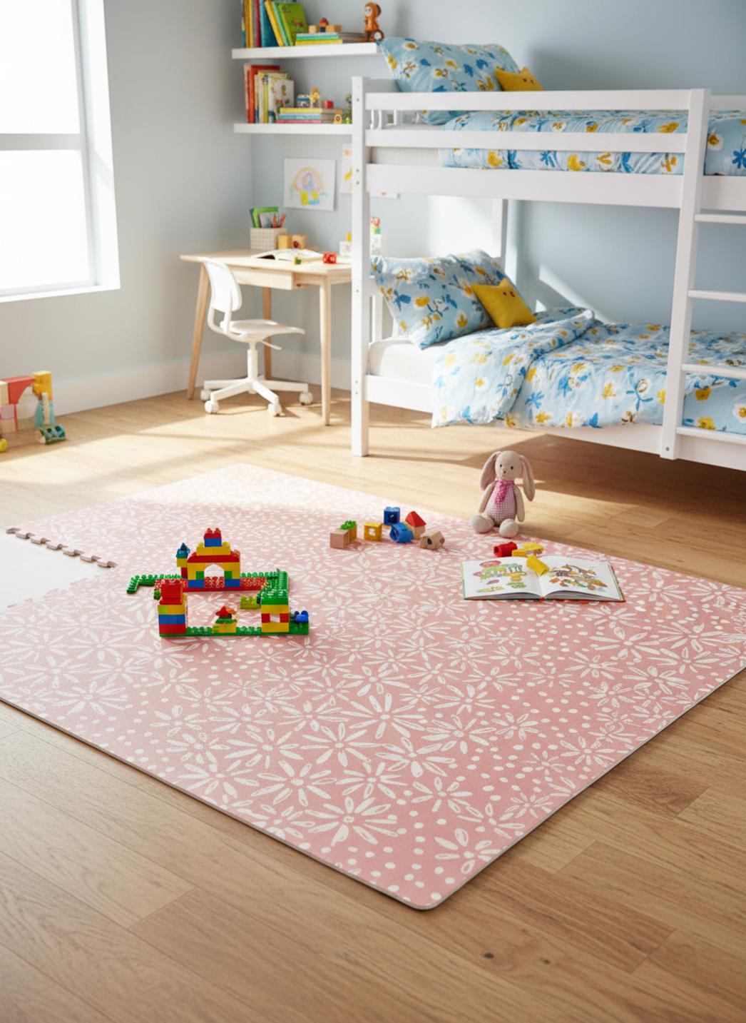 Esthétiquement, le motif floral apporte une touche poétique et ludique à la décoration: les petites fleurs imprimées se mêlent aux tons tendres pour créer un univers rose délicat, accordable avec un berceau en bois clair, des coussins chamarrés et une lampe au halo chaud. La grande taille permet d'aménager un coin lecture et un coin jeu distincts, tout en harmonisant l'ensemble de la chambre.