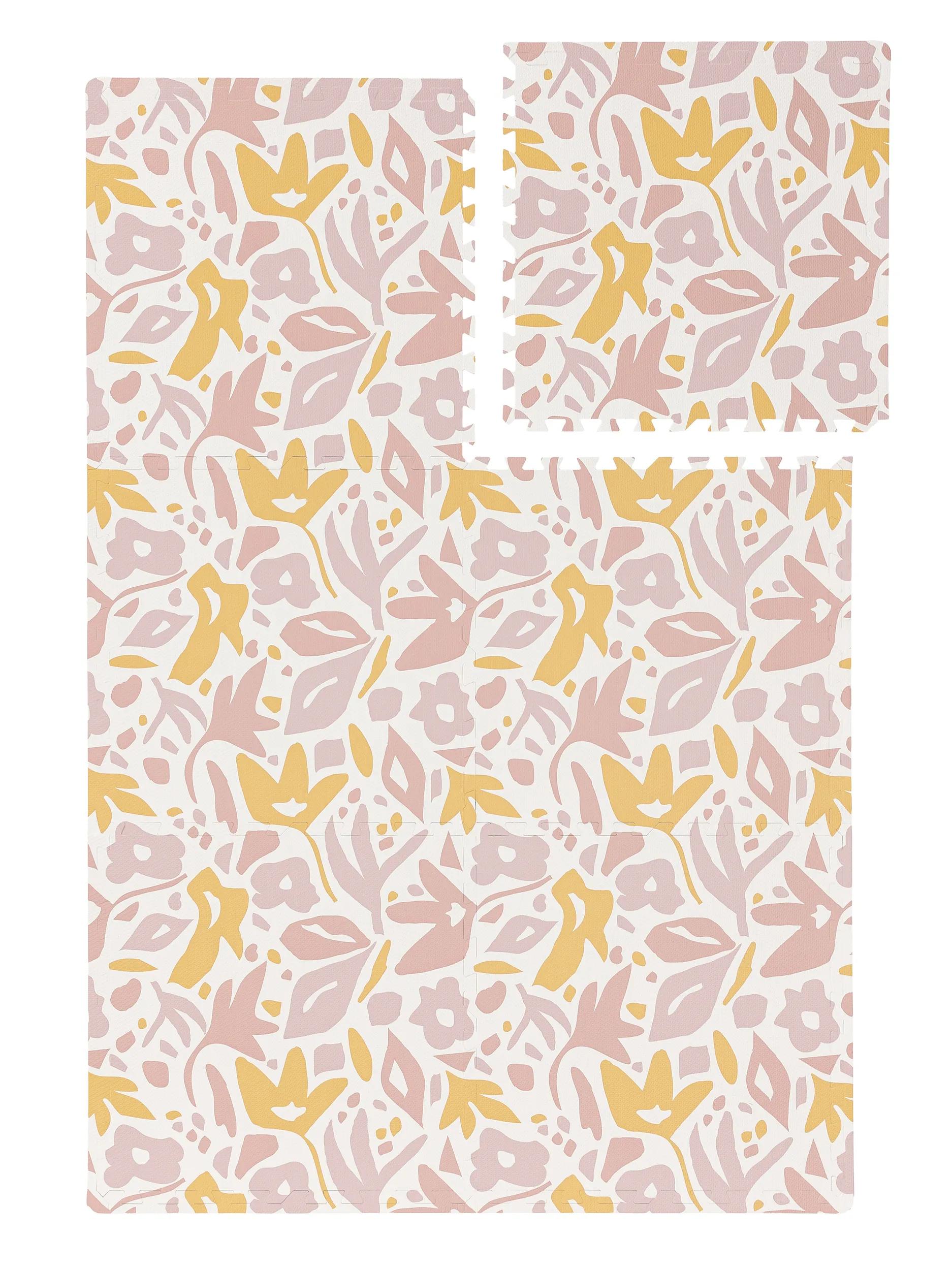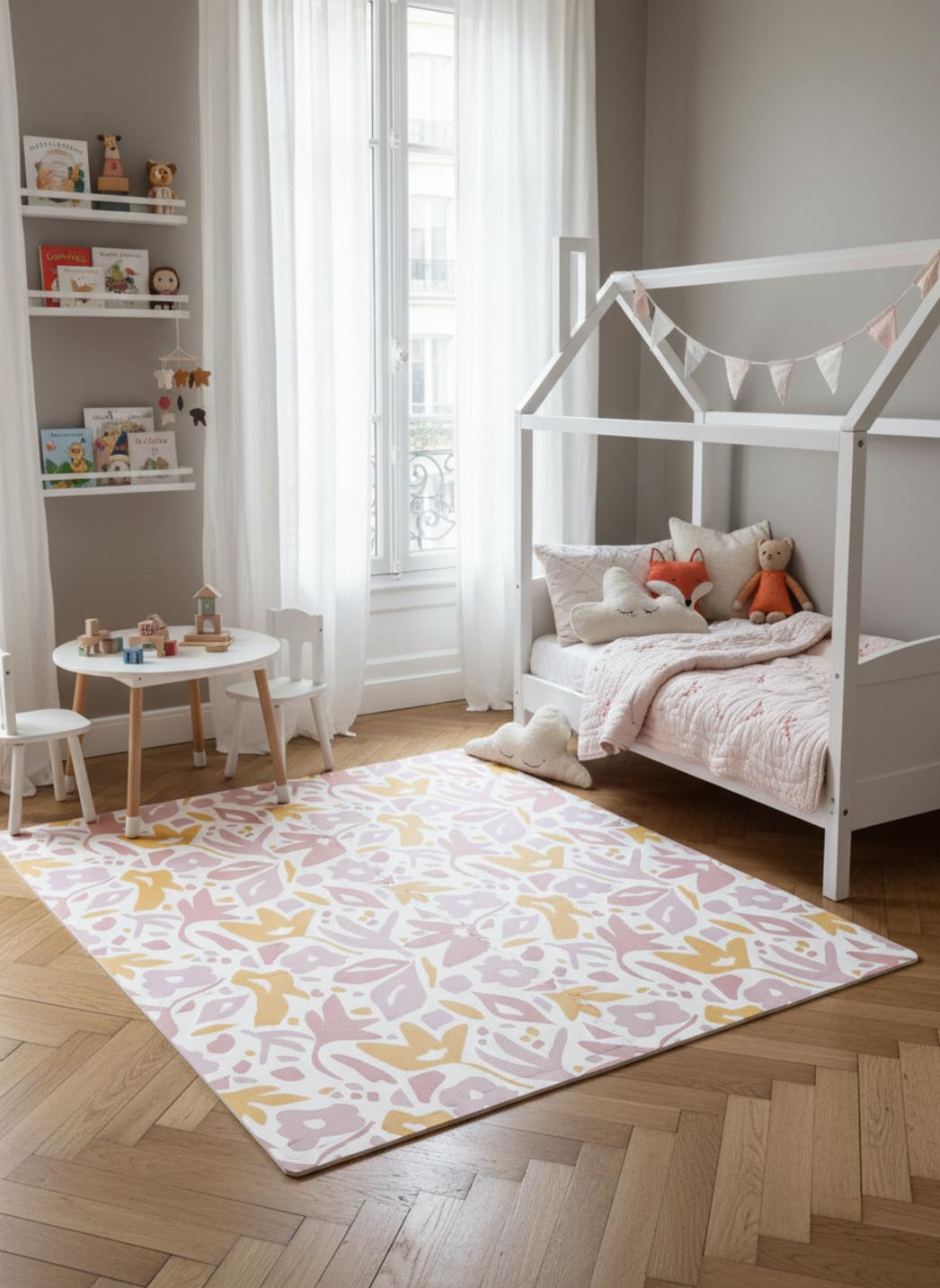 L’esprit du dessin repose sur une composition ludique qui rappelle les pétales et les encastrements, comme un grand fleur-puzzle au sol, où chaque pièce devient un terrain de jeu. Les touches de rose et de orange apportent chaleur et gaieté, se mêlant aux tons du mobilier et à la lumière douce d’un abat-jour pour créer une chambre qui respire la tendresse. Les dimensions généreuses permettent d’aménager un coin lecture, un coin jeu et un espace pour les premiers pas en toute sécurité.