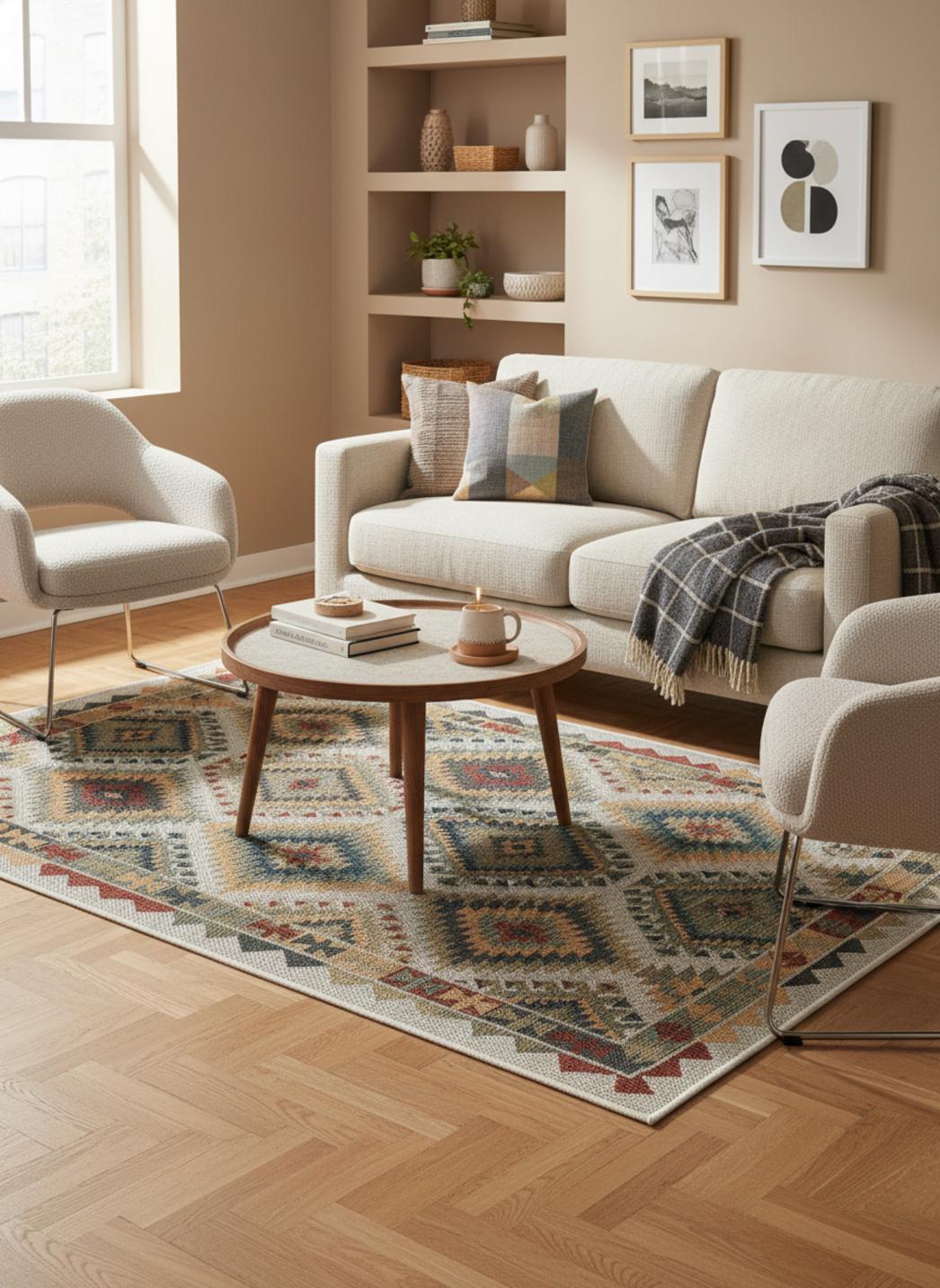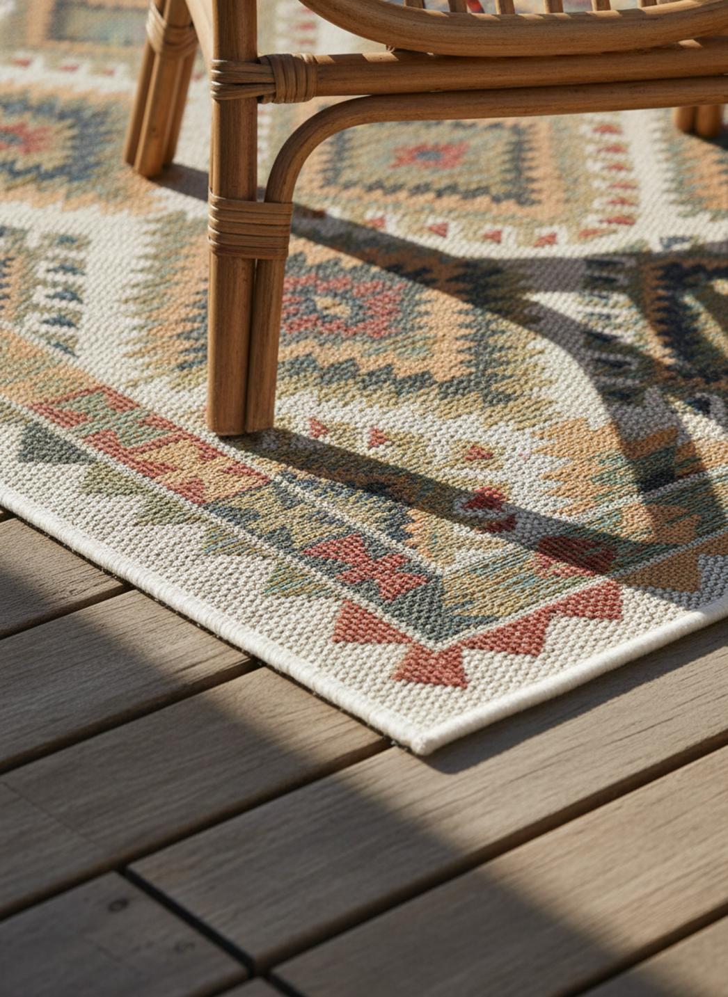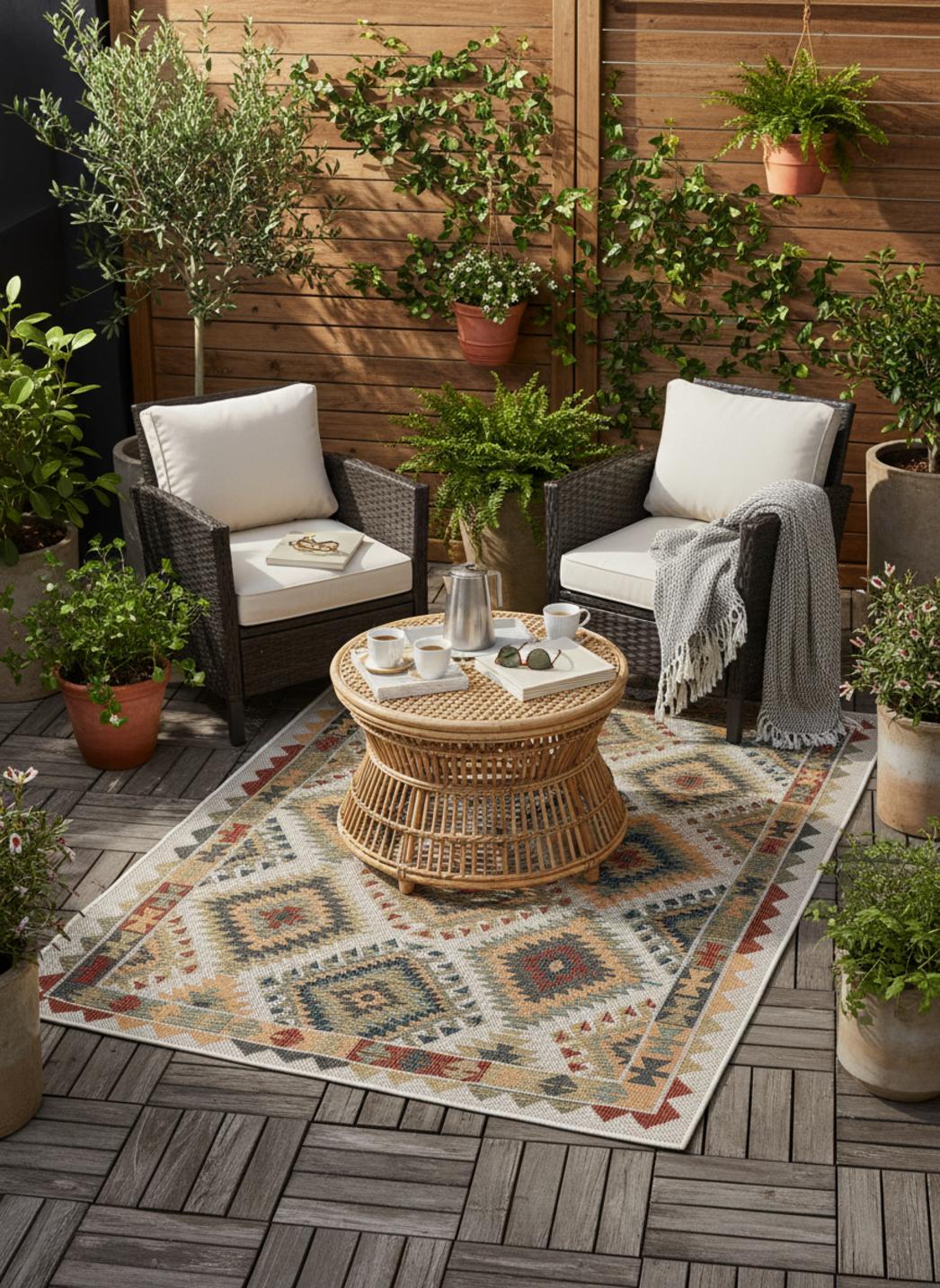 Chaleureux et expressif, ce tapis au style ethnique et à l’esprit bohème séduit par la richesse de ses motifs et sa palette multicolore pleine de vie. Véritable invitation à la convivialité, il transforme une terrasse, un balcon ou un petit patio en un espace vibrant et inspirant. Ses teintes vives et équilibrées évoquent les voyages, la liberté et l’artisanat, tout en conservant une harmonie visuelle qui s’intègre facilement à différents styles de décoration extérieure. Dans un format pratique de 80x150 cm, il délimite un coin détente ou une zone repas tout en apportant du caractère et de la chaleur. Les motifs d’inspiration bohème, riches et variés, captent la lumière du jour et animent le sol d’un charme authentique. Ce tapis s’accorde naturellement avec les matériaux bruts comme le bois, la pierre ou le rotin, créant un ensemble à la fois naturel et coloré. On l’imagine entouré de plantes, de coussins tissés et de mobilier clair, pour une ambiance extérieure pleine d’énergie et de douceur. Un tapis qui respire la liberté et la bonne humeur, parfait pour un esprit bohème assumé.