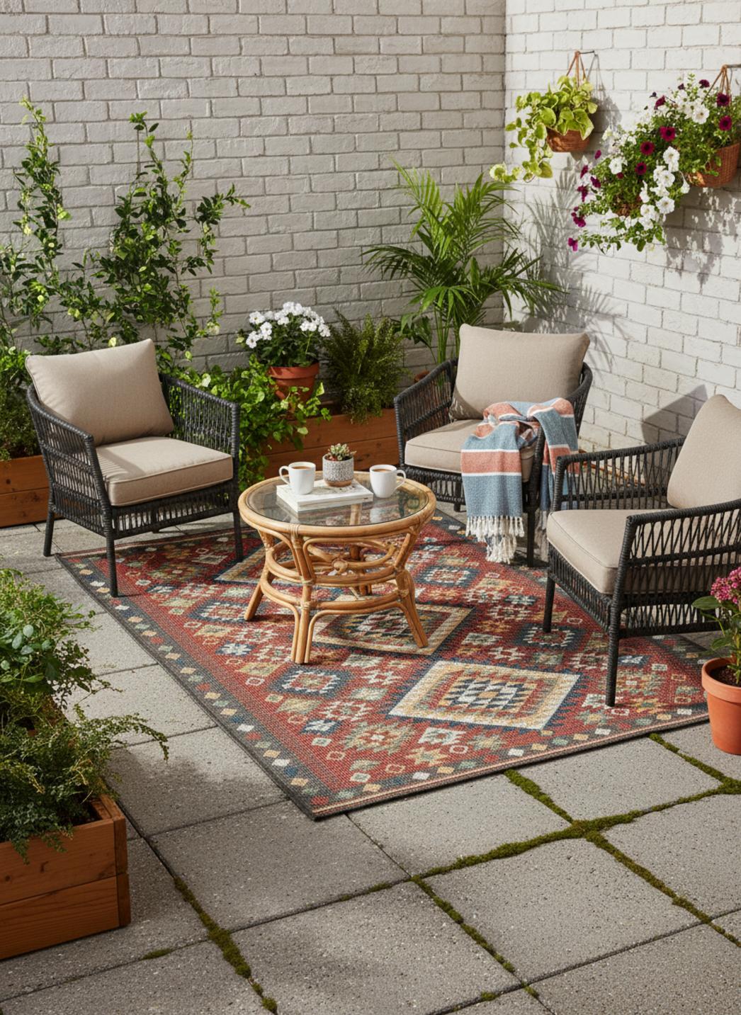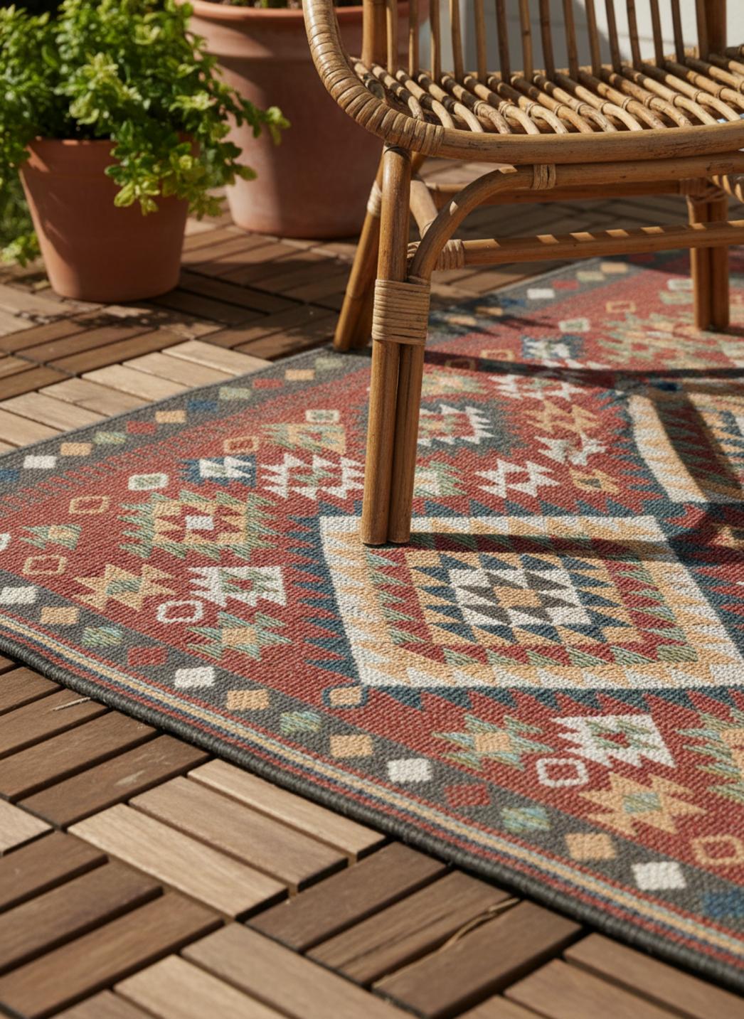 Éclatant et expressif, ce tapis au style ethnique se distingue par ses motifs géométriques et sa palette multicolore pleine de vitalité. Dans un format compact de 80x150 cm, il trouve aisément sa place sur une terrasse urbaine, un balcon ensoleillé ou un petit coin lounge extérieur. Ses couleurs vives et équilibrées insufflent une énergie positive, transformant le sol en un véritable tableau vivant. Chaque motif évoque les influences des tissages traditionnels, tout en conservant une touche contemporaine qui s’accorde aux espaces modernes. Ce tapis capte la lumière du jour et dynamise la décoration, tout en créant une atmosphère conviviale et inspirante. Parfait pour délimiter une zone de détente, un espace repas ou une transition entre intérieur et extérieur, il s’associe facilement à des matériaux naturels comme le rotin, la pierre ou le bois clair. On aime son caractère chaleureux et solaire, qui invite à la détente autant qu’à la convivialité. Véritable atout décoratif, il insuffle à la terrasse ou au balcon une personnalité audacieuse et joyeuse, tout en préservant l’équilibre et l’harmonie d’un aménagement plein de vie.