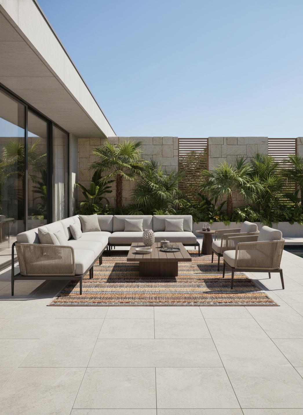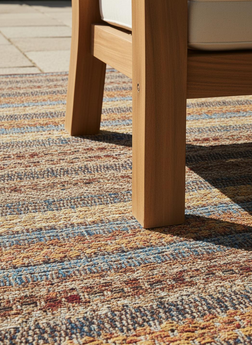 Sur une grande terrasse animée par la lumière du jour, ce tapis ethnique imprimé tressé multicolore s’impose comme une véritable pièce maîtresse. Son motif vibrant mêle une mosaïque de teintes chaudes et profondes qui semblent danser sous le soleil : touches d’ocre, de rouge, de bleu et de vert s’entrelacent dans un équilibre maîtrisé, à la fois vivant et harmonieux. Le tressage visible renforce l’authenticité du dessin, rappelant les tissages artisanaux qui traversent le temps. Dans un espace extérieur de grande ampleur, son format généreux 240x340 cm permet de structurer un salon d’extérieur, un coin repas ou même une terrasse d’hôtel, tout en apportant une identité forte et chaleureuse. Ses couleurs joyeuses trouvent un écho naturel auprès du mobilier en bois clair, du rotin ou du métal noir, créant une ambiance solaire et conviviale. Chaque regard découvre une nouvelle nuance, un détail discret, une vibration différente selon la lumière du moment. Ce tapis multicolore incarne l’esprit d’un extérieur vivant et expressif, un lieu d’échanges et de détente où la couleur devient langage et la matière, émotion. Il invite à profiter pleinement de la beauté des jours lumineux, dans une atmosphère pleine de vie et d’harmonie.