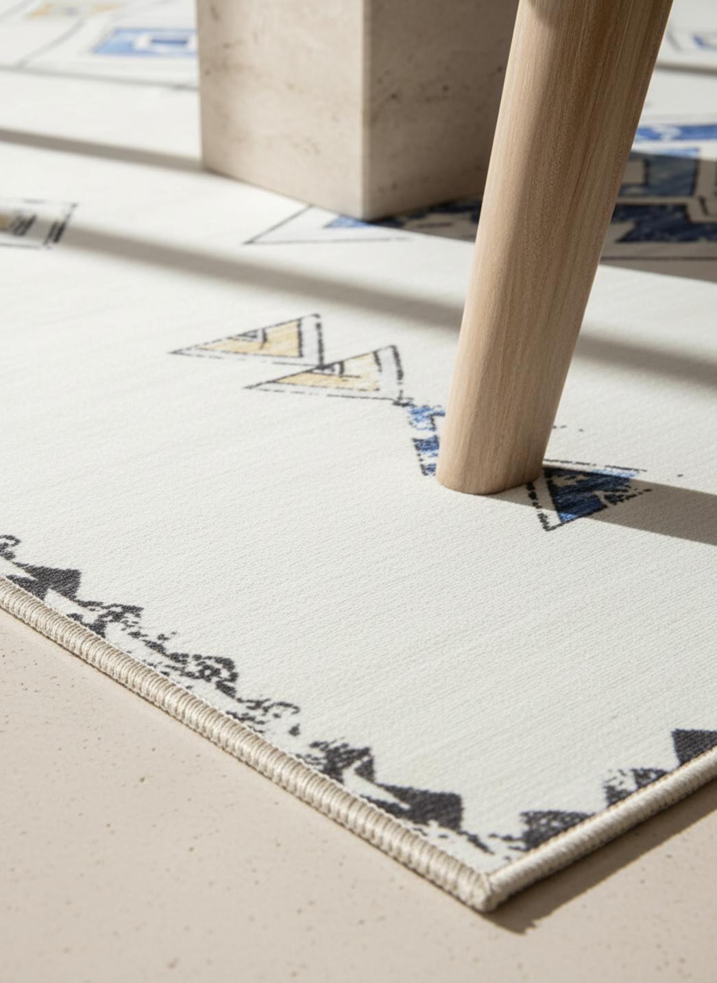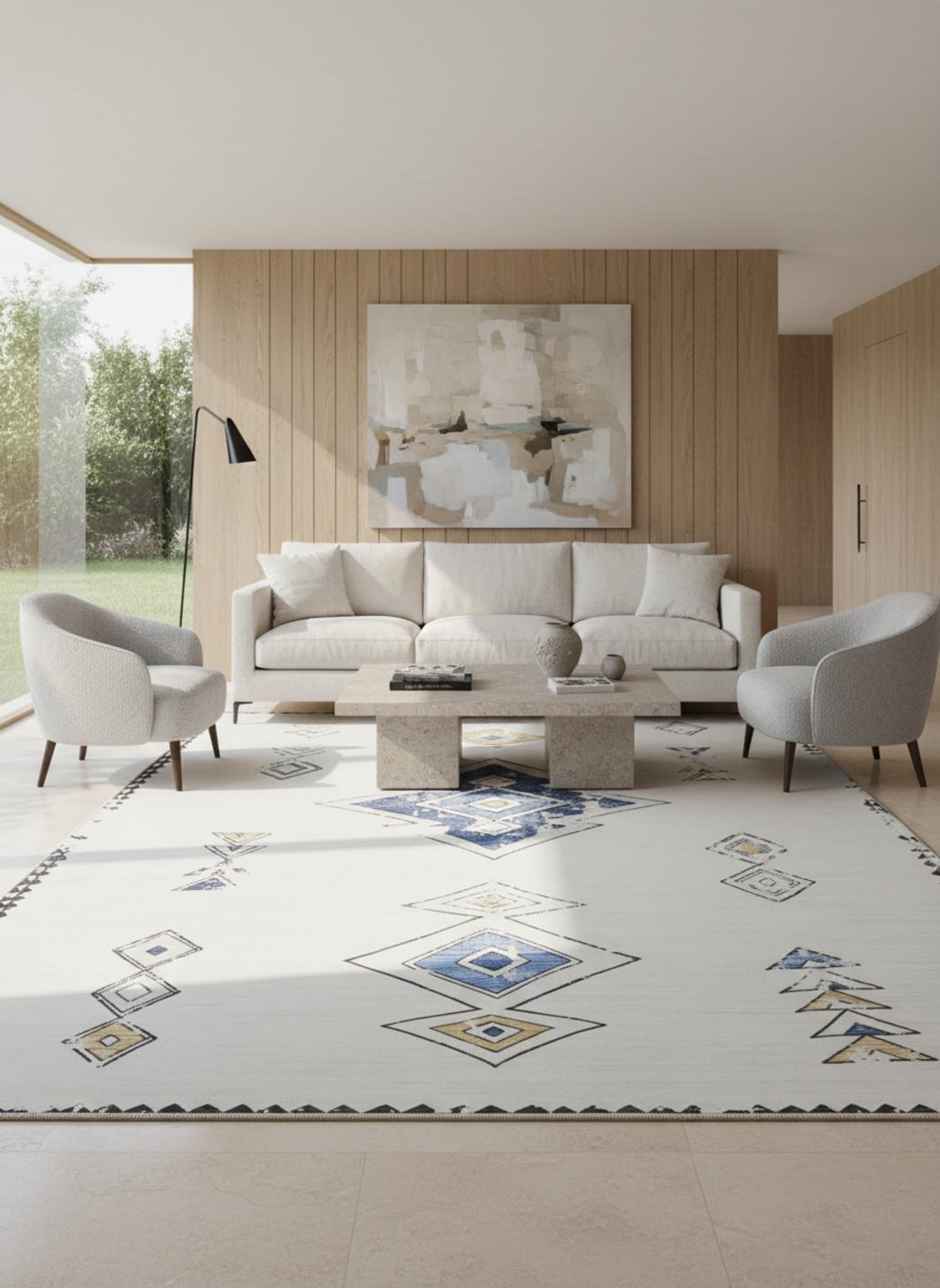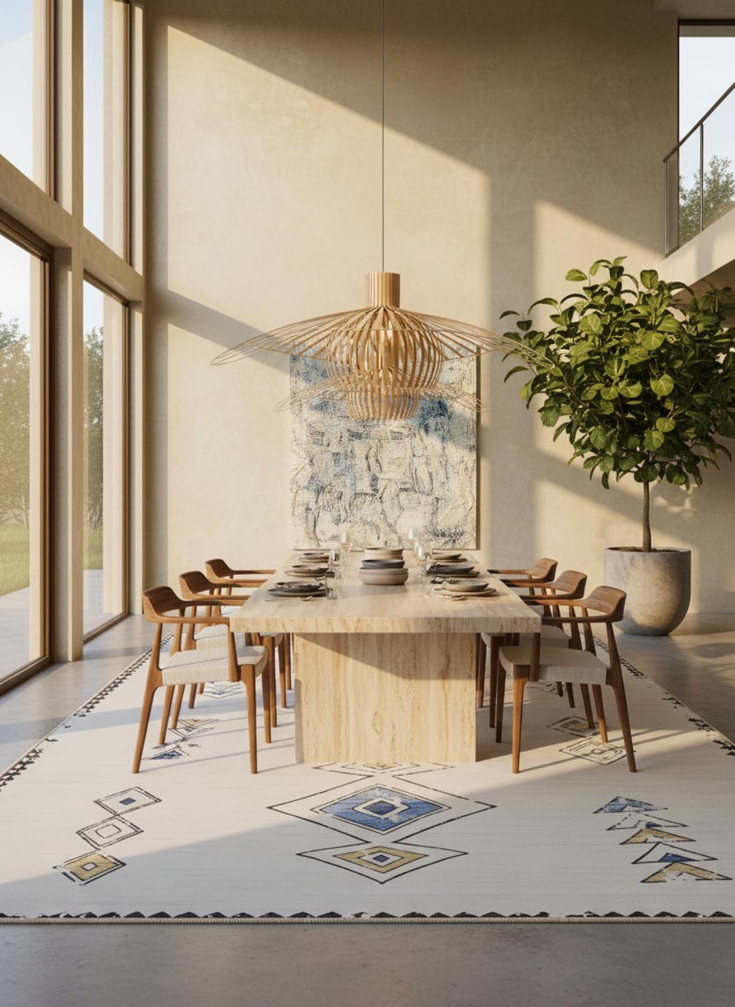 Sous une lumière tamisée, ce tapis évoque la douceur d'un intérieur où le voyage rencontre la simplicité, un hommage discret à l'esthétique berbère réinterprétée pour un salon contemporain, offrant une présence chaleureuse sans jamais surcharger l'espace.