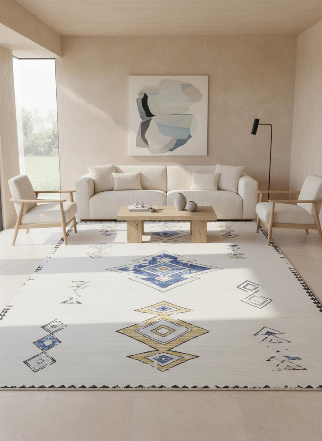 Dans un salon baigné de lumière, la fibre narrative de ce tapis puise son inspiration dans l’art berbère pour apporter une présence à la fois authentique et apaisée, où les teintes beige rencontrent des accents bleu comme autant de touches peintes à la main, créant un paysage chaleureux et délicat sous le canapé.