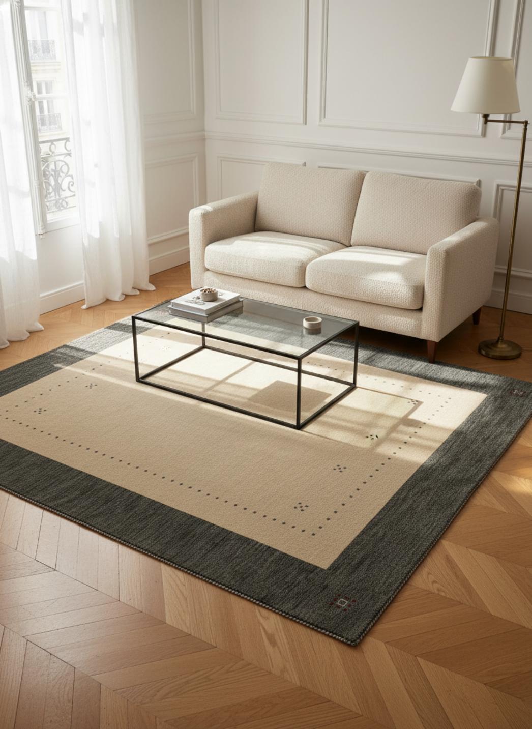 Dans un salon baigné de lumière, ce tapis raconte une histoire de douceur et de chaleur, où les tons de beige et de gris s'entrelacent comme un voile apaisant. La présence subtile du vocabulaire berbère se devine en motifs qui rythment la pièce sans jamais la dominer, donnant au regard des pauses graphiques et élégantes qui invitent à la détente.