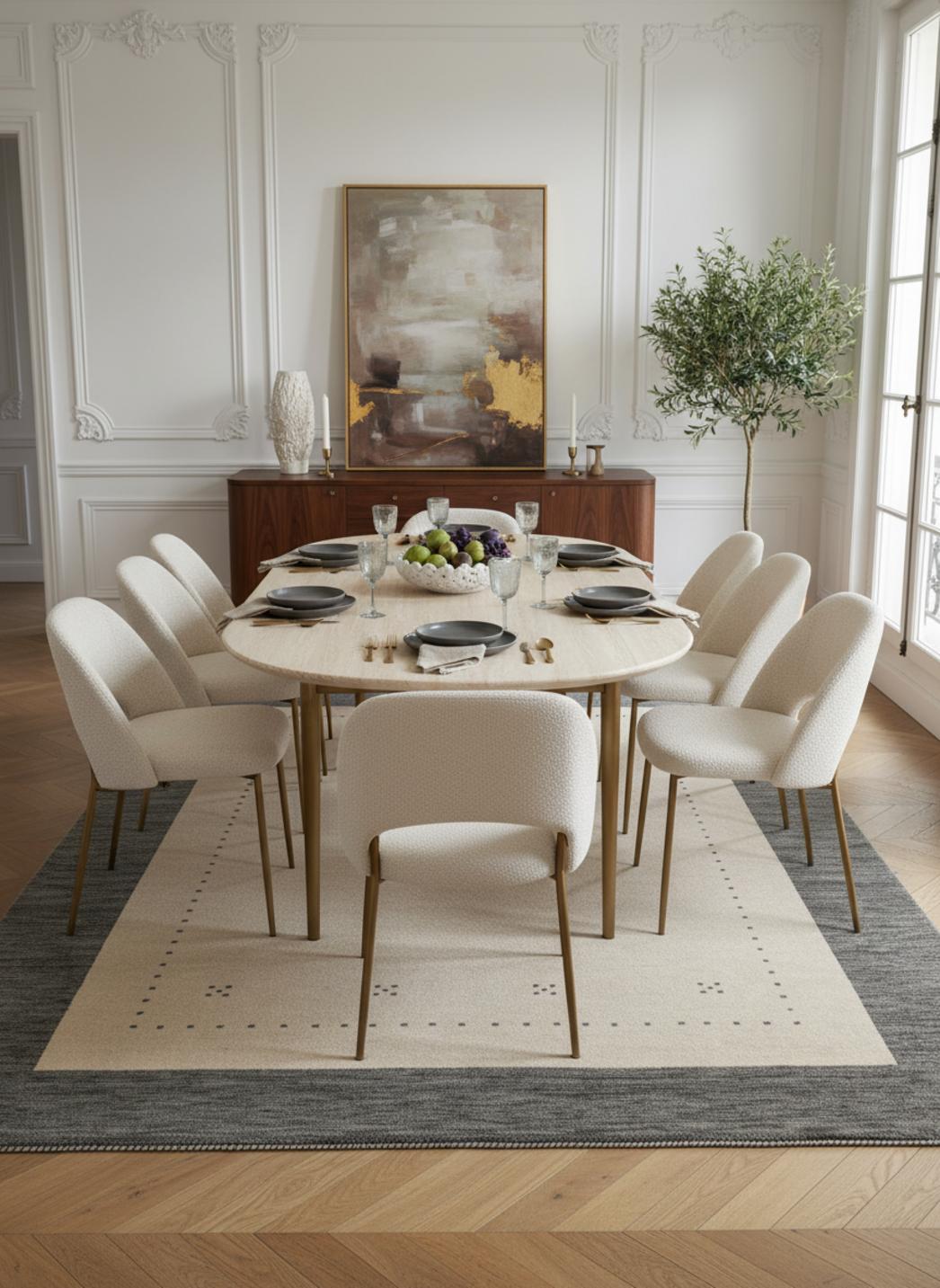 La palette joue de douceur avec des nuances dominantes de beige et de gris, une alliance naturelle qui élève l’ambiance sans la surcharger. Les contrastes graphiques en touches plus sombres rappellent les motifs Beni Ouarain, tandis que la clarté du fond laisse la pièce respirer et invite la lumière à danser sur la surface.