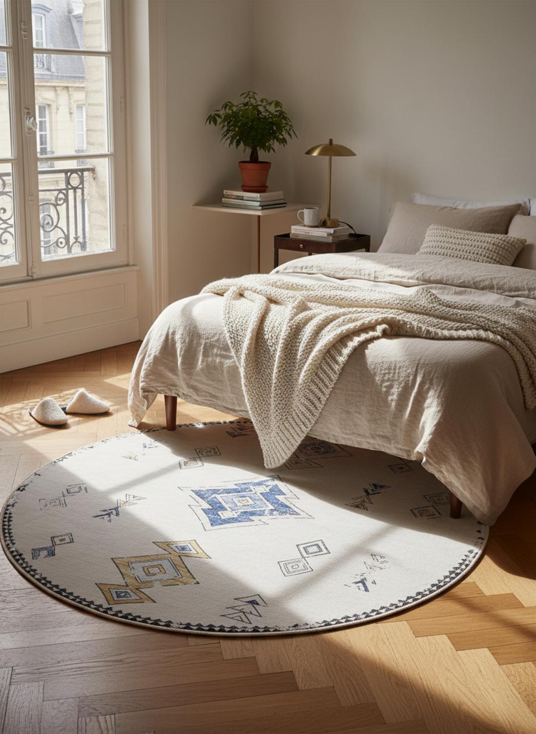 En format compact et accueillant, ce modèle rond devient un point d’ancrage dans un salon bohème ou au pied d’un lit, sa silhouette douce soulignant l’agencement d’un espace sans l’alourdir, et sa dimension de 120 cm de diamètre crée une zone intime où se déposent coussins et lumière naturelle.