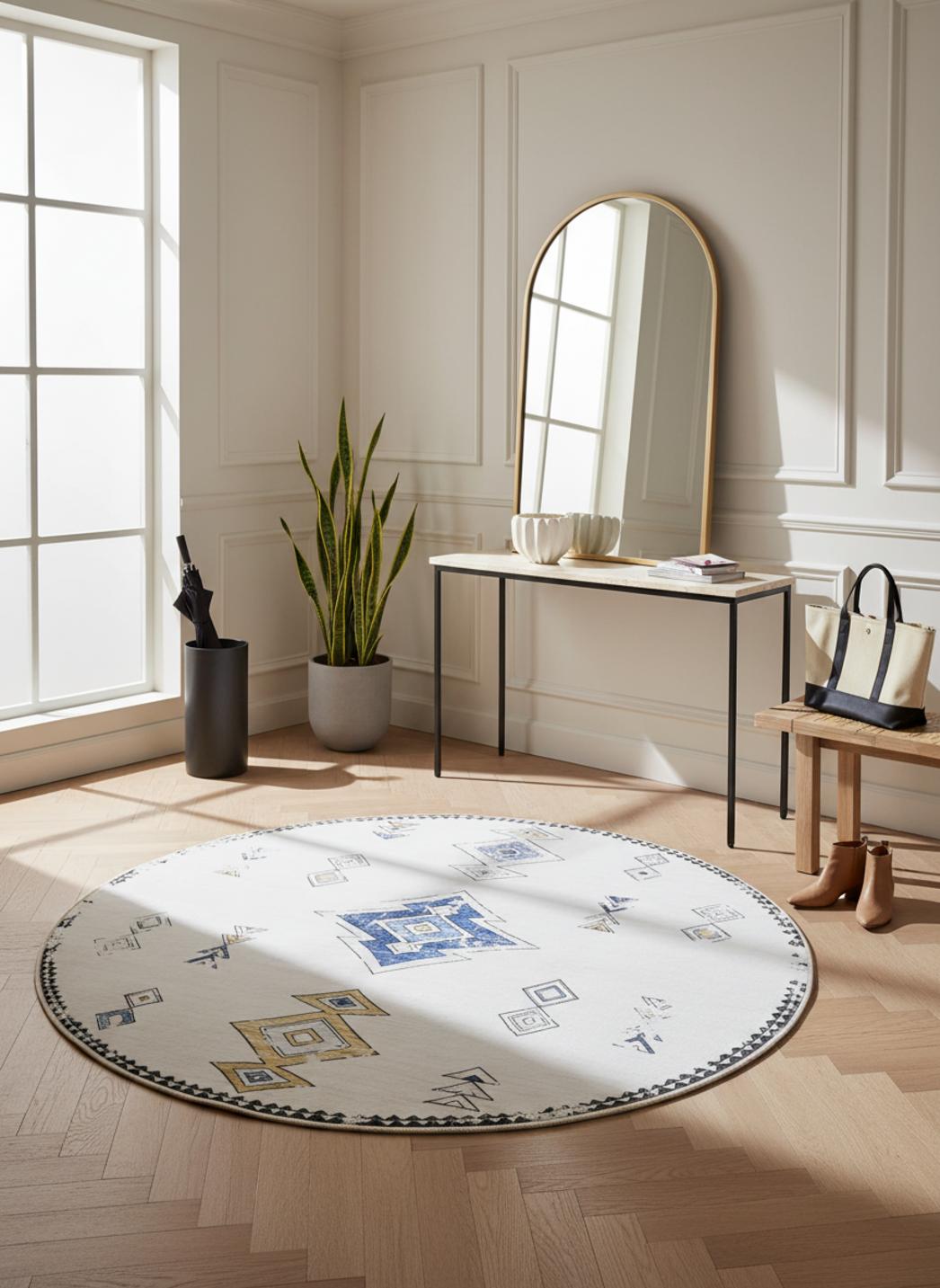 Tapis ethnique inspiration berbère rond beige et bleu lavable 120 cm de diamètre