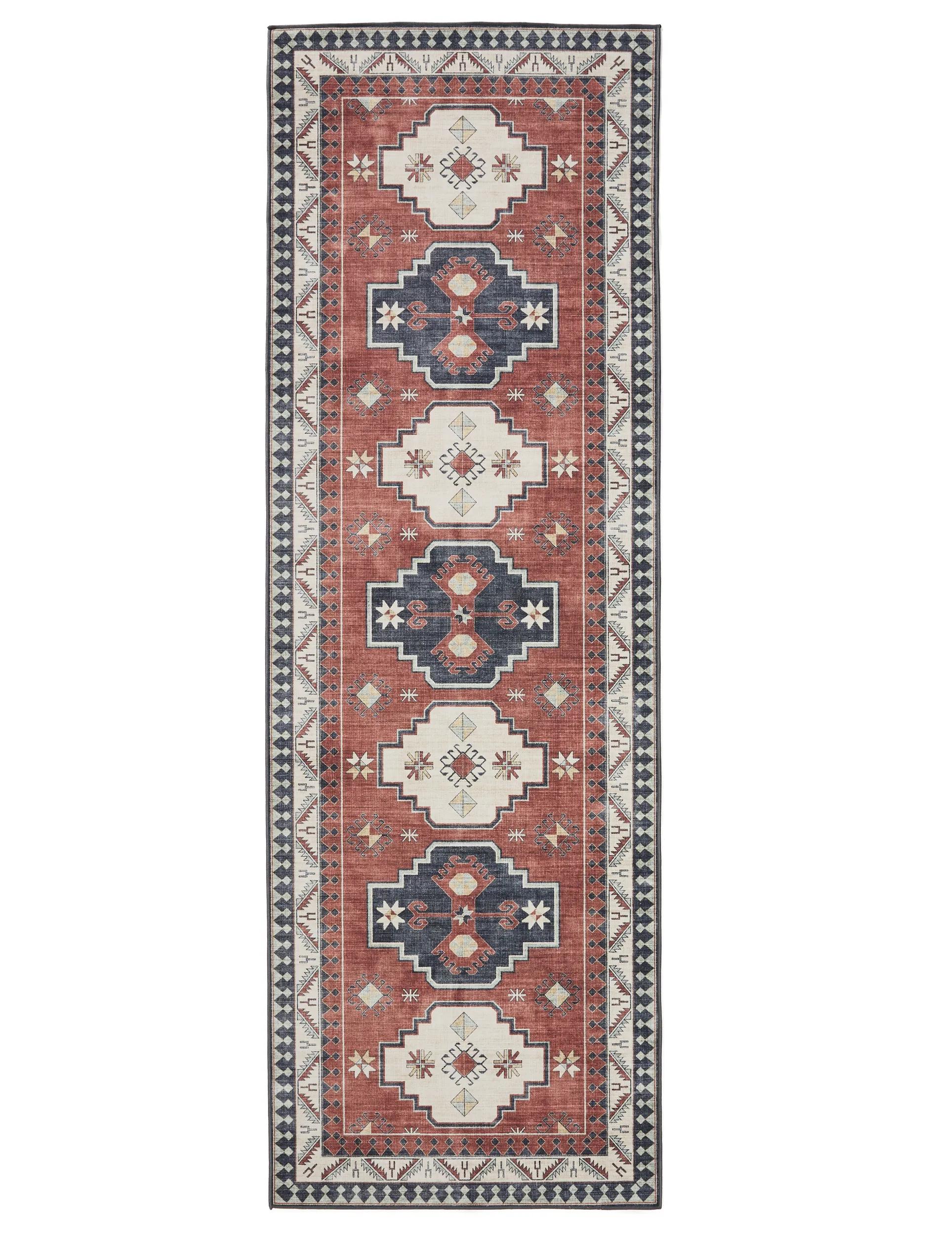 Tapis ethnique inspiration oriental de couloir rouge et beige lavable 80x240 cm