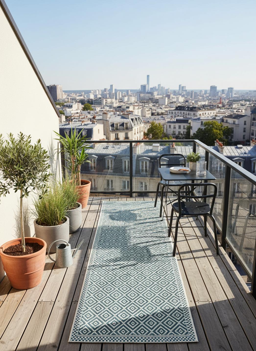 Alliant authenticité et modernité, ce tapis au style ethnique et au motif géométrique se distingue par sa teinte bleue profonde, évocatrice de fraîcheur et de sérénité. Sa forme allongée de 80x240 cm en fait le compagnon idéal pour les espaces extérieurs de passage, comme une allée de terrasse, un balcon étroit ou le long d’un salon de jardin. Inspiré des tissages traditionnels, son motif régulier apporte structure et rythme, tandis que la couleur bleue diffuse une élégance naturelle, rappelant le ciel ou la mer. Ce tapis de couloir s’intègre avec aisance dans un décor aux matériaux bruts — bois, pierre, rotin — et équilibre la chaleur des teintes naturelles par sa fraîcheur lumineuse. Il guide le regard et allonge la perspective, transformant les passages en zones de caractère et d’harmonie. On l’imagine bordant une table d’extérieur ou soulignant un espace de circulation entre deux zones de détente. Véritable trait d’union décoratif, il insuffle aux espaces extérieurs un esprit voyageur et apaisant, où l’artisanat rencontre la modernité dans une parfaite cohérence visuelle.
