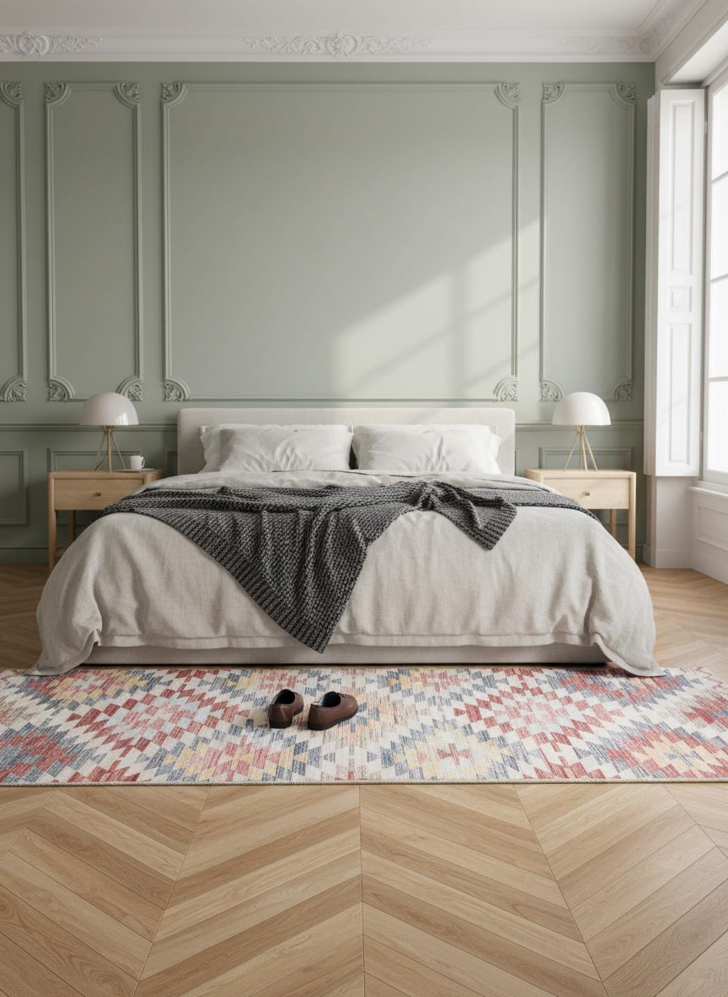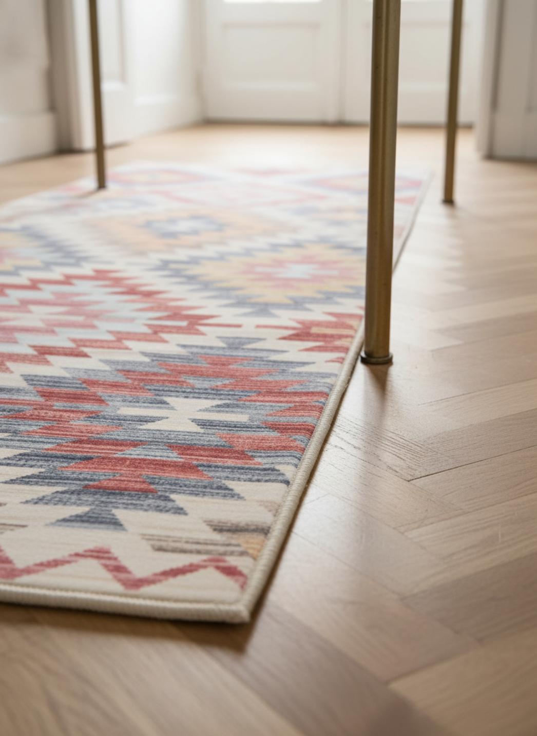 La présence d’un motif à la fois sobre et vivant transforme l’entrée en un itinéraire visuel. Le vocabulaire ethnique se conjugue avec des motifs angulaires pour créer un rythme qui pulse le sol sans l’alourdir. Les formes répétitives rappellent des chevrons et des losanges, alternant pleins et vides, et invitent le regard à suivre un chemin organisé et chaleureux.