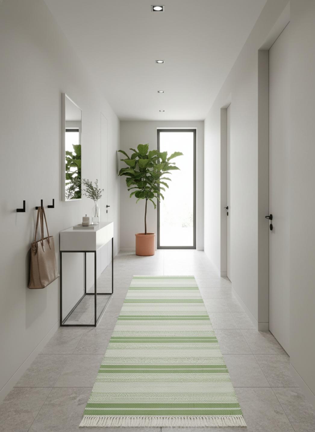 Le tapis ethnique rayé à franges de couloir vert insuffle une énergie naturelle et fluide à l’espace qu’il traverse. Ses rayures fines dessinent une ligne de mouvement apaisante, tandis que le vert, ton végétal et rafraîchissant, apporte une touche d’équilibre et de vitalité. Les franges légères prolongent cette impression de souplesse, accentuant le charme artisanal du tissage. En 80x250 cm, il accompagne la circulation avec naturel, reliant les pièces dans une continuité visuelle douce et lumineuse. Ce modèle incarne la simplicité vivante des tapis d’extérieur, où texture et couleur se fondent dans un même élan décoratif. Son tissage à plat capte la lumière et révèle de subtils contrastes entre les nuances de vert. On retrouve cet esprit authentique et fluide dans la gamme de tapis de balcon, idéale pour prolonger la fraîcheur du style ethnique jusque dans les espaces les plus étroits. Un tapis qui fait du passage un instant de douceur et de légèreté.