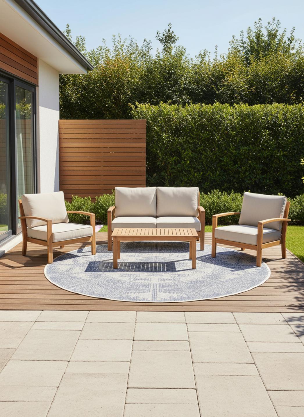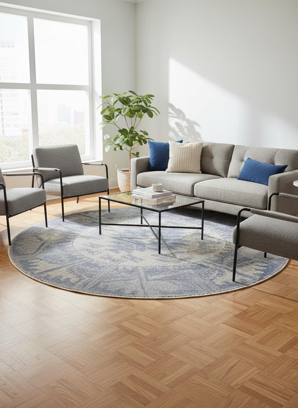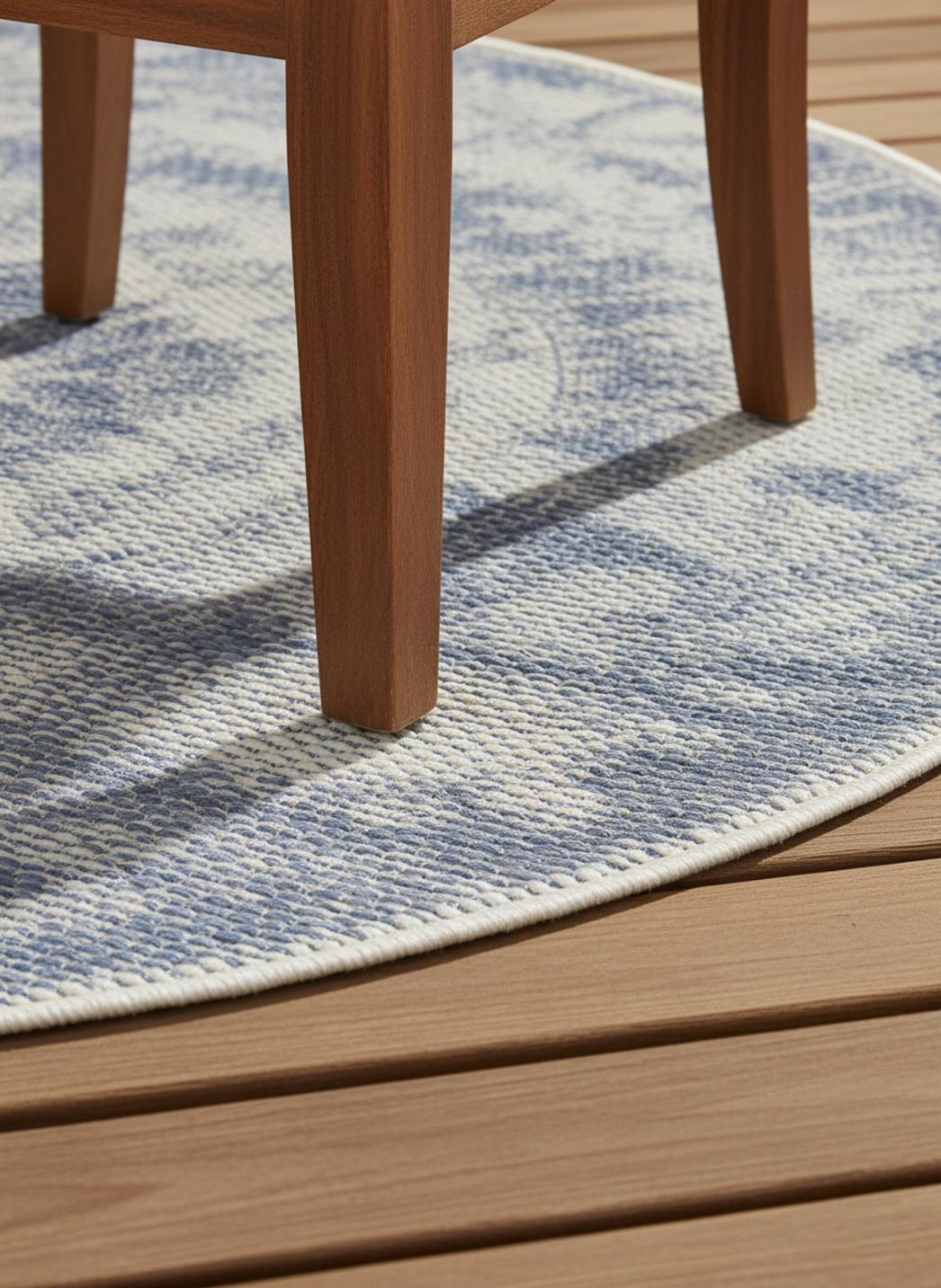 Évoquant la douceur des matières naturelles et la sérénité des tons froids, le tapis ethnique rond gris et bleu invite à la détente et à l’équilibre. Son dessin inspiré des tissages traditionnels se déploie en cercles réguliers, formant un motif harmonieux où la géométrie rencontre la douceur. Le gris, neutre et apaisant, se marie à la profondeur du bleu pour créer une ambiance raffinée et contemporaine. En 160 cm de diamètre, il trouve naturellement sa place au centre d’un salon, d’une terrasse ou sous une table basse, reliant intérieur et extérieur dans une continuité sereine. Ce modèle illustre la beauté texturée de la collection de tapis d’extérieur, où les teintes minérales s’associent à la lumière du jour pour composer des décors équilibrés. Sa texture tissée à plat révèle un subtil jeu de reflets et de nuances. Cette même harmonie bleutée se retrouve dans la sélection de tapis d’extérieur ronds, idéale pour créer des ambiances calmes et élégantes. Un tapis qui transforme la simplicité en sérénité, entre ciel et matière.