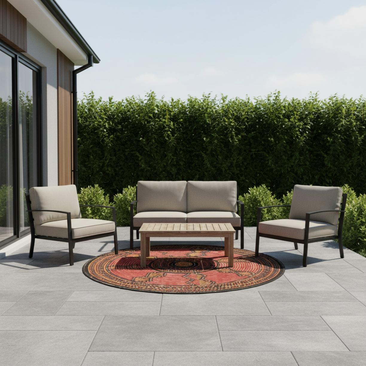 Audacieux et captivant, ce tapis au style ethnique séduit par la puissance de ses contrastes entre le rouge profond et le noir intense. Sa forme ronde de 160 cm de diamètre apporte douceur et équilibre visuel à une terrasse, un balcon ou un patio, tout en instaurant une atmosphère pleine de caractère. Inspiré des motifs traditionnels, il dégage une authenticité forte et une énergie vibrante qui dynamisent l’espace. Le rouge évoque la chaleur et la convivialité, tandis que le noir structure la composition et lui confère une élégance intemporelle. Ce tapis devient le point d’ancrage d’une décoration extérieure audacieuse : placé sous une table circulaire, un fauteuil suspendu ou au centre d’un coin lounge, il attire naturellement le regard. Ses motifs ethniques racontent une histoire de voyage et de tradition, tout en s’intégrant harmonieusement dans les aménagements contemporains. Il dialogue avec les matières naturelles comme le rotin, la pierre ou le bois, apportant profondeur et intensité à la scène. Véritable pièce maîtresse, il transforme chaque espace extérieur en un lieu de vie expressif et chaleureux, empreint d’âme et de personnalité.