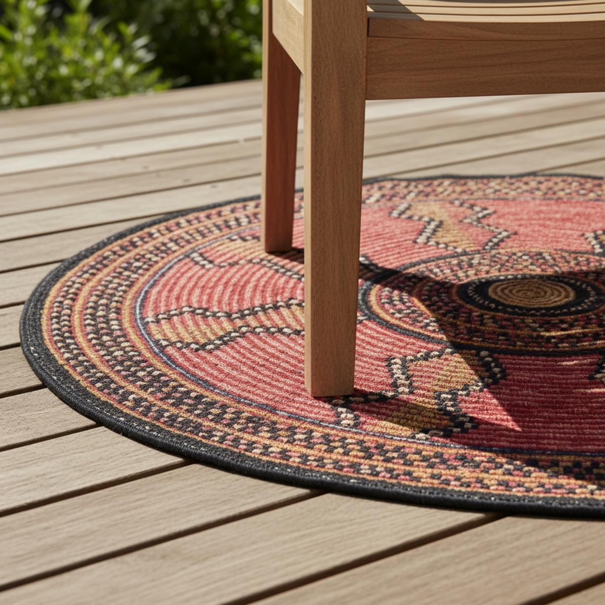 Tapis ethnique rond rouge et noir d'intérieur et d'extérieur 160 cm de diamètre