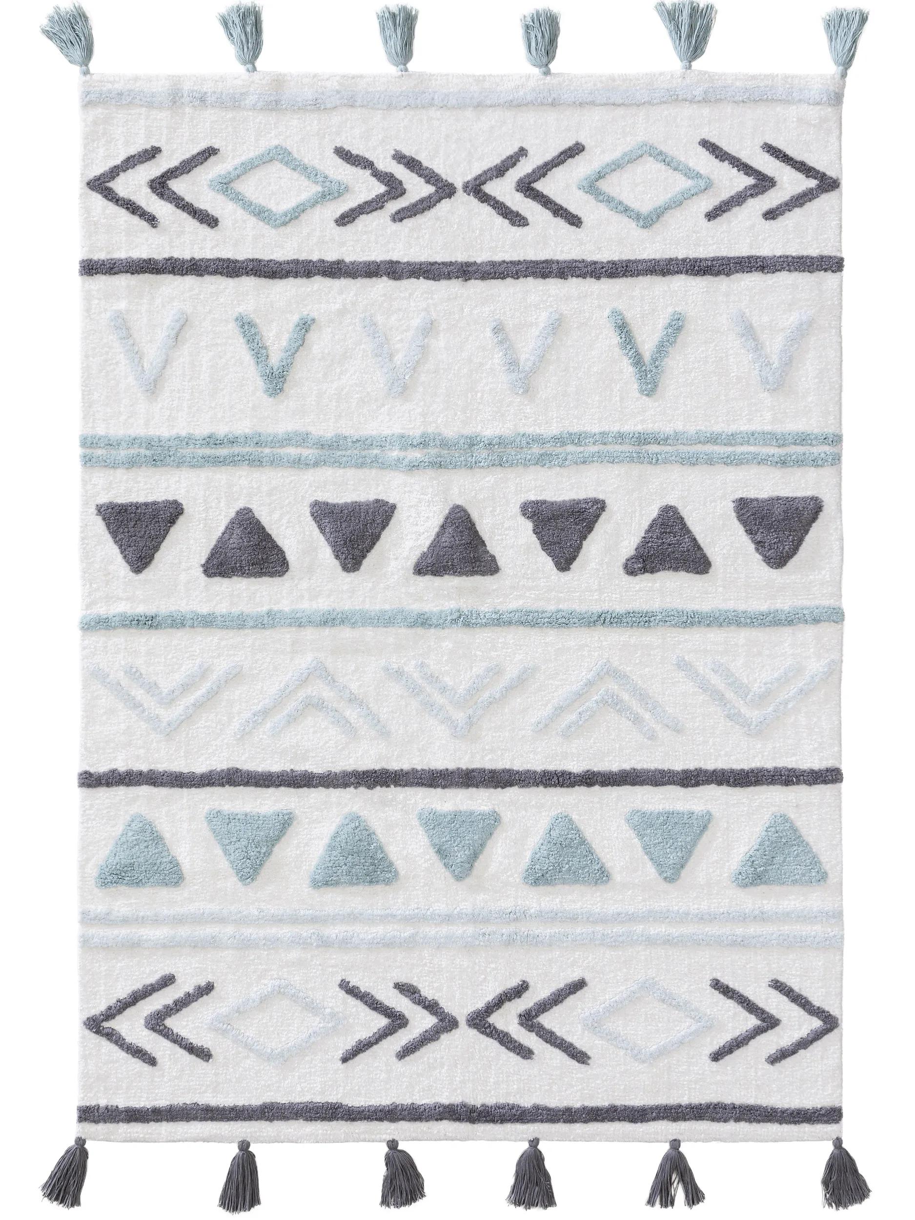 L’esthétique joue son rôle de berceau visuel : les teintes bleu et blanc posent une atmosphère lumineuse et apaisante, facile à marier avec un mobilier clair ou des textiles plus doux. Les franges ajoutent une touche ludique et artisanele, incitant à l’imagination et aux petites aventures imaginaires, transformant le sol en île, en route ou en tapis volant pour les histoires du soir.