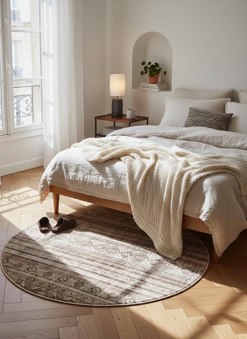 Dans un salon ou proche d'un fauteuil, cet objet-decor devient un véritable cocon, lisse et enveloppant grâce à sa forme ronde. Les variations chromatiques, entre teintes passées et nuances terreuses, modulent la lumière et apportent une atmosphère feutrée qui adoucit les contours de la pièce. On imagine la sensation sous les pieds, une caresse régulière qui stabilise et réchauffe l'espace, transformant un simple sol en scène vivante et accueillante.