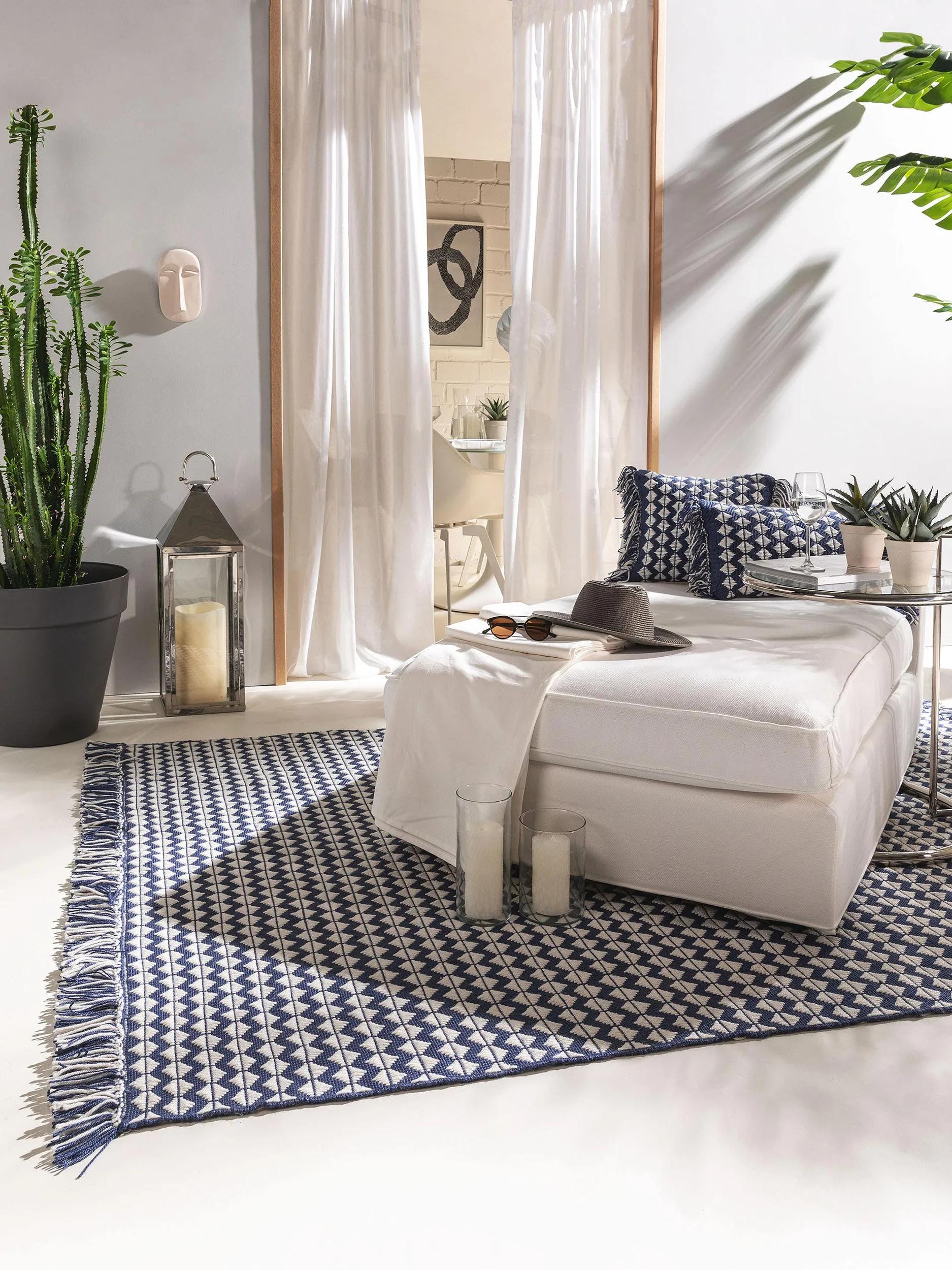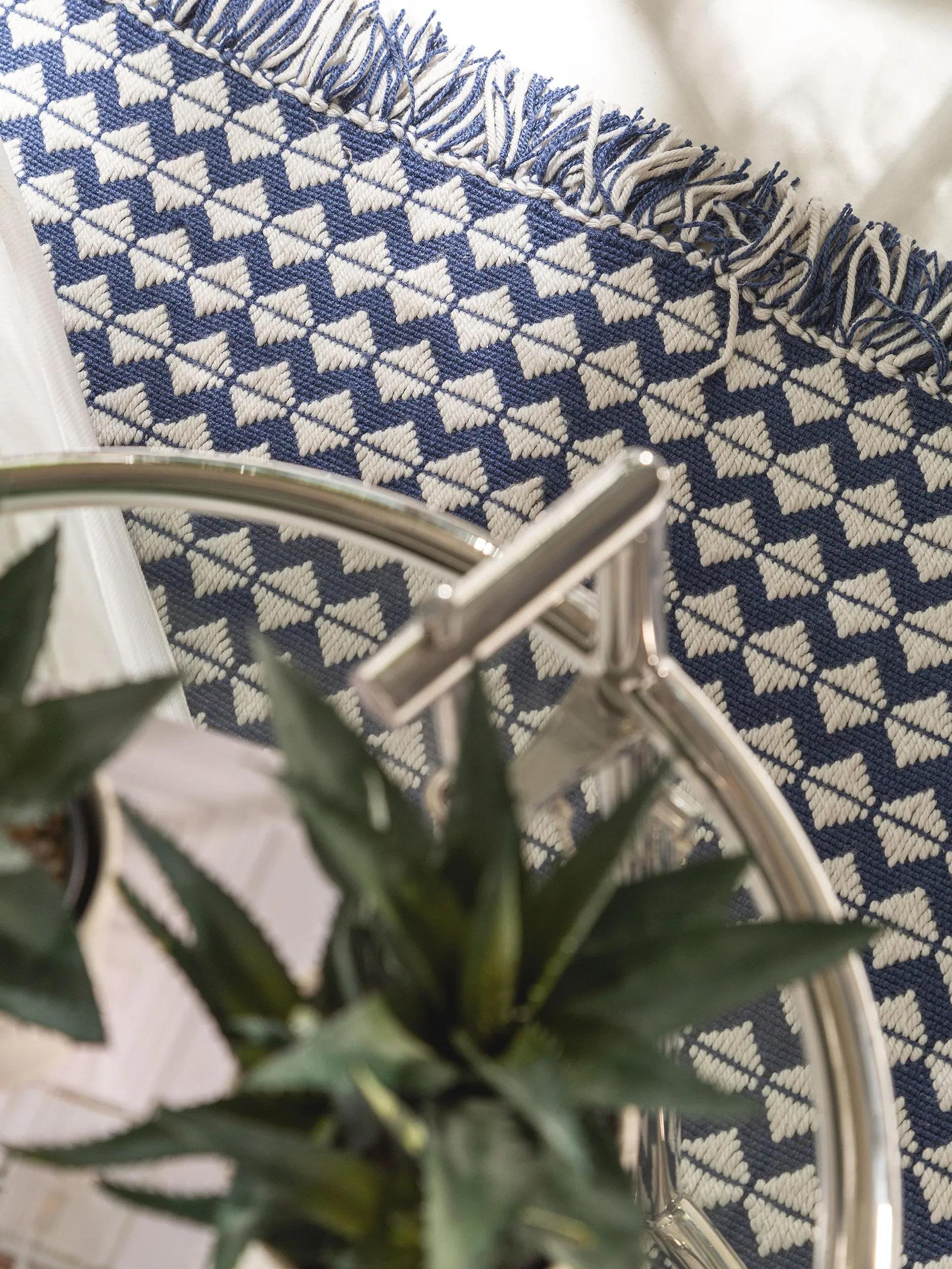 À chaque pas, la matière révèle son caractère : densité contenue, caresse sous le pied et mouvement discret des franges. Le contraste du bleu marine avec le blanc confère à la pièce une énergie douce, capable d’affirmer un style scandinave ou urbain selon le mobilier. Le tapis transforme la lumière et module la sensation de chaleur, invitant au confort sans renoncer à la rigueur graphique.