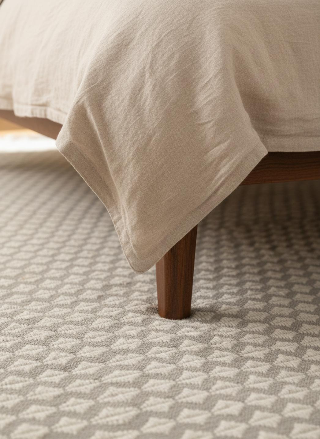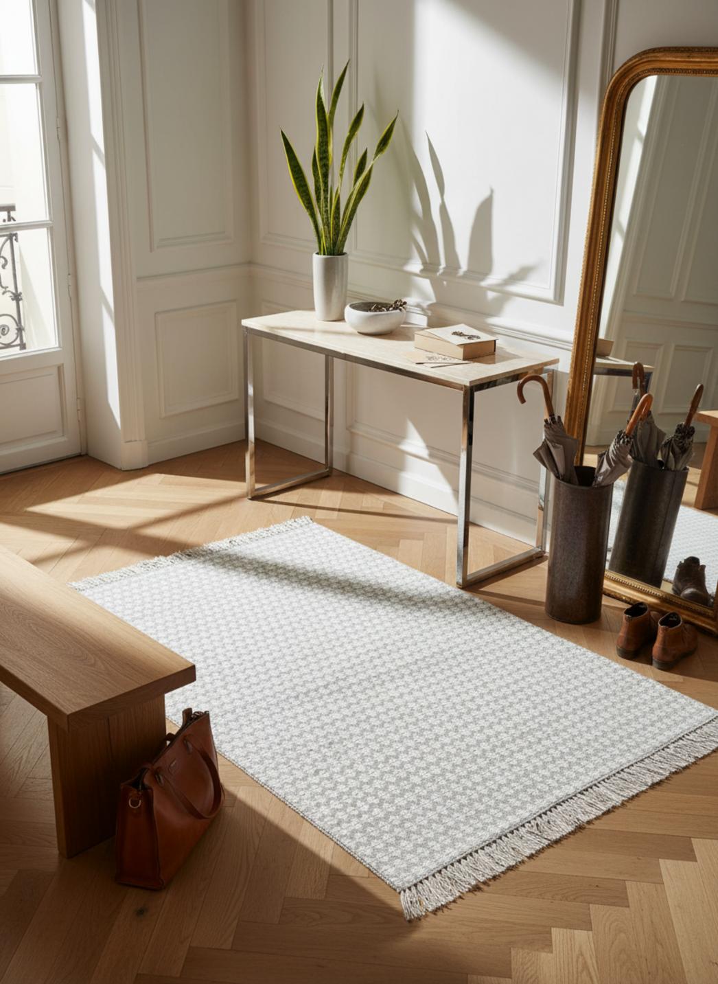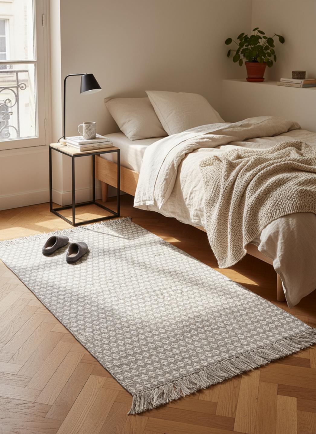 Sous les pas, la sensation est contenue et rassurante ; le tapis reste discret tout en offrant un point d’ancrage tactile. La neutralité du duo gris/blanc module la lumière et amplifie les volumes sans rivaliser avec les couleurs du mobilier, tandis que les jeux de texture donnent de la présence à la pièce.
