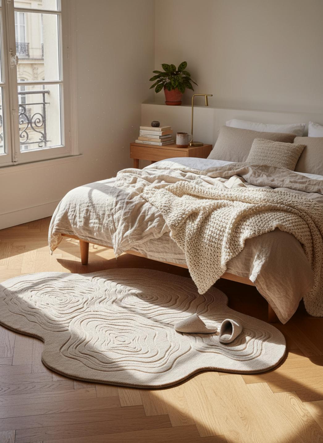 Dans une chambre, il crée un seuil chaleureux au pied du lit ; dans une entrée, il trace un passage élégant ; dans un petit salon, il recentre le mobilier sans l’écraser. La structure rectangulaire apporte une logique géométrique claire et permet d’organiser la décoration autour d’un point d’ancrage apaisant.