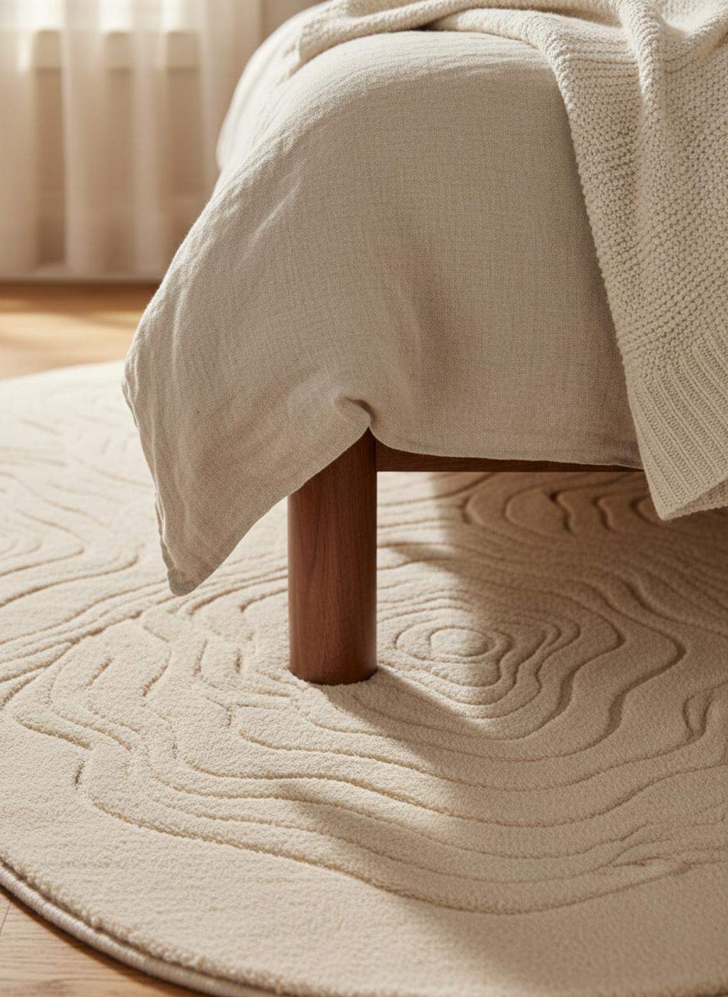 La matière, travaillée pour offrir un toucher dense et feutré, apporte une sensation chaleureuse sous les pieds. Les boucles mesurées et le relief subtil font vivre le motif selon la lumière, et le tapis répond aussi bien à une marche tranquille qu’à un moment de pause, toujours avec une présence douce et maîtrisée.