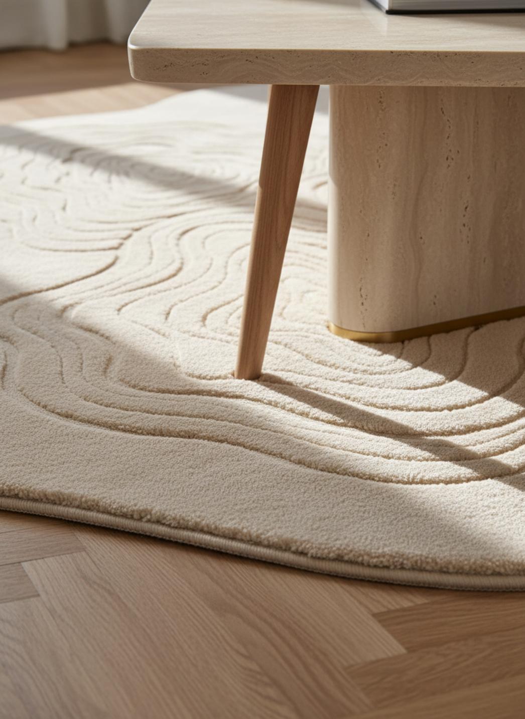 Dans une palette dominée par le beige, la lumière se diffuse et les volumes paraissent adoucis, comme si le sol devenait un voile chaleureux. La teinte neutre invite à superposer meubles et textiles, elle adoucit les contrastes et transforme le tapis en point de calme, idéal pour une atmosphère scandinave ou un salon contemporain où l'on privilégie la douceur visuelle.