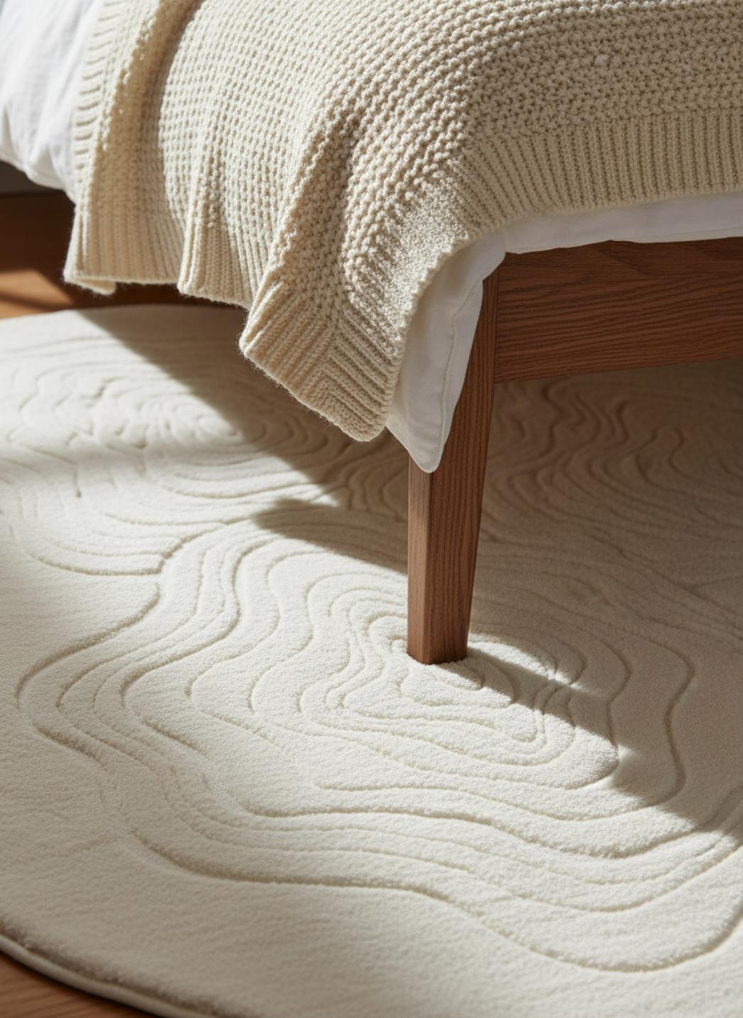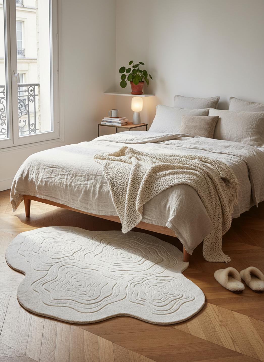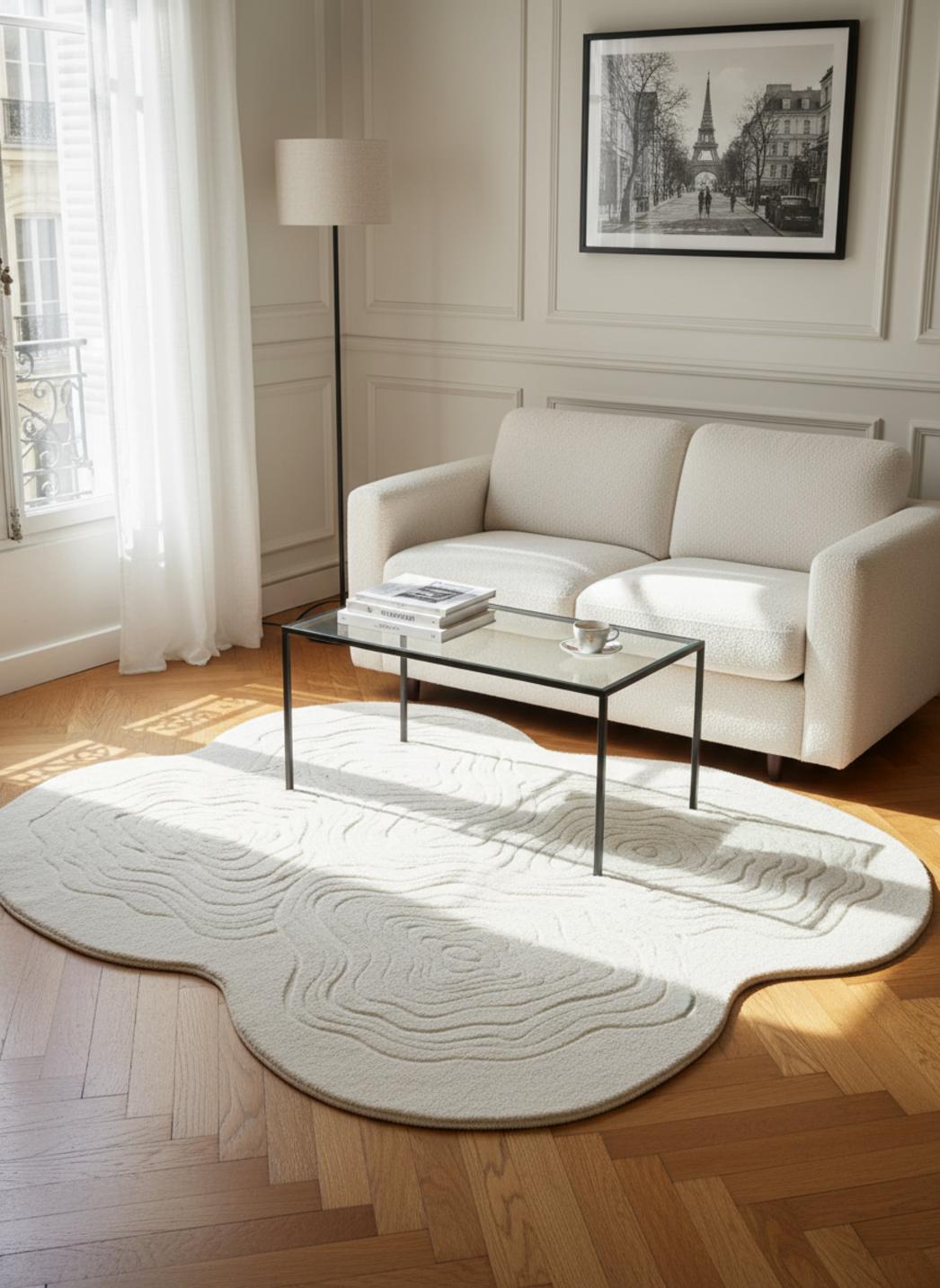 Dans une pièce baignée de lumière, la palette claire renforce une atmosphère scandinave et apaisée, tandis que, face à des éléments plus foncés, l’ensemble gagne en modernité et en contraste. Le tapis module la perception des volumes, agrandit un espace petit et apporte une note graphique dans un intérieur épuré, sans jamais dominer la mise en scène décorative.