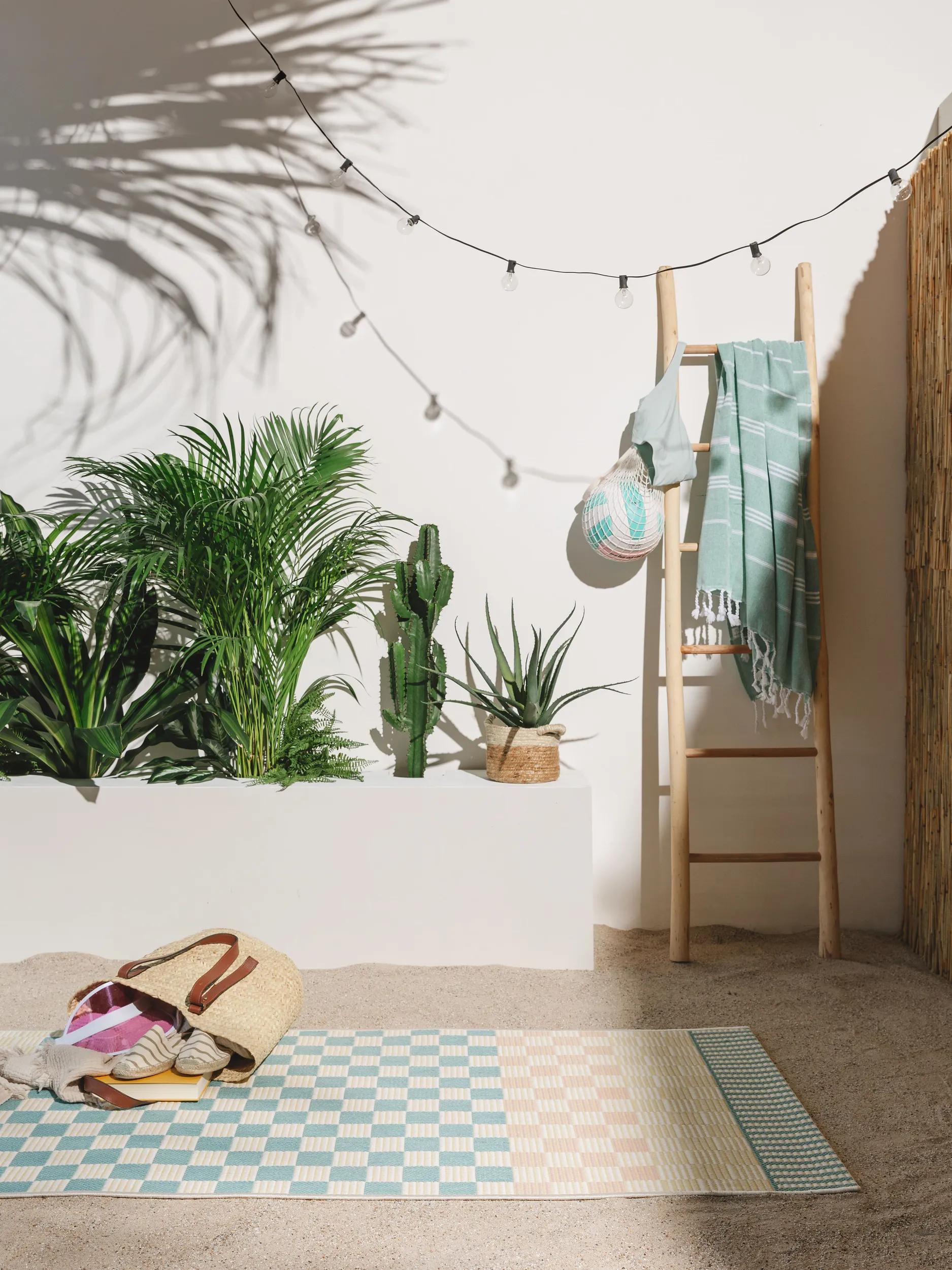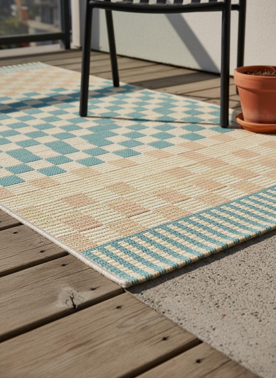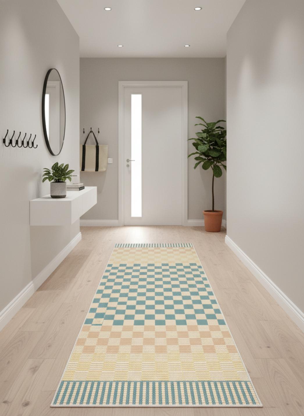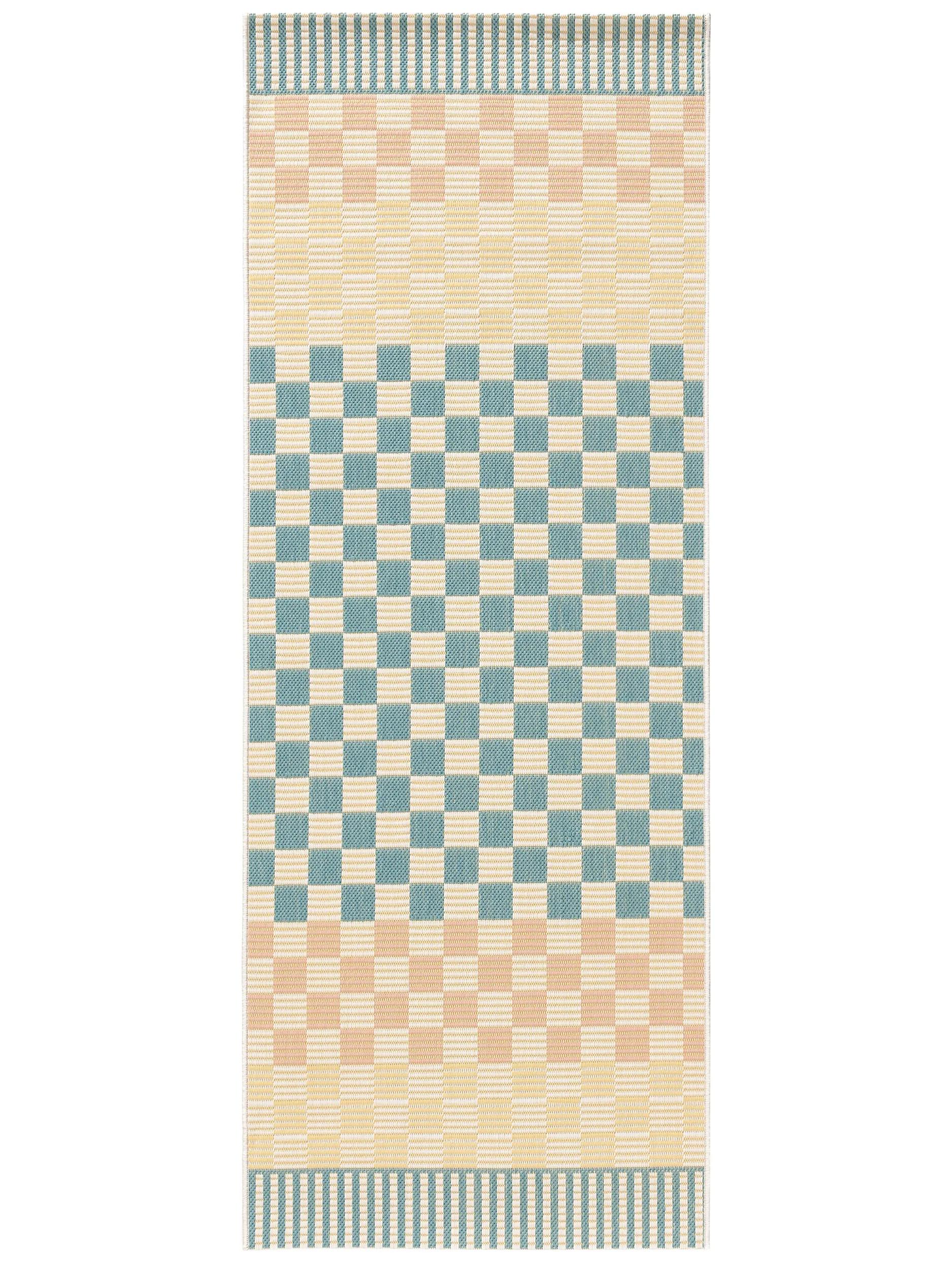 Tapis géométrique damier de couloir vert d'eau et beige d'intérieur et d'extérieur 80x200 cm
