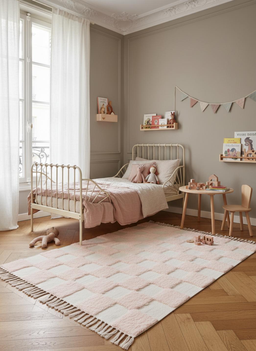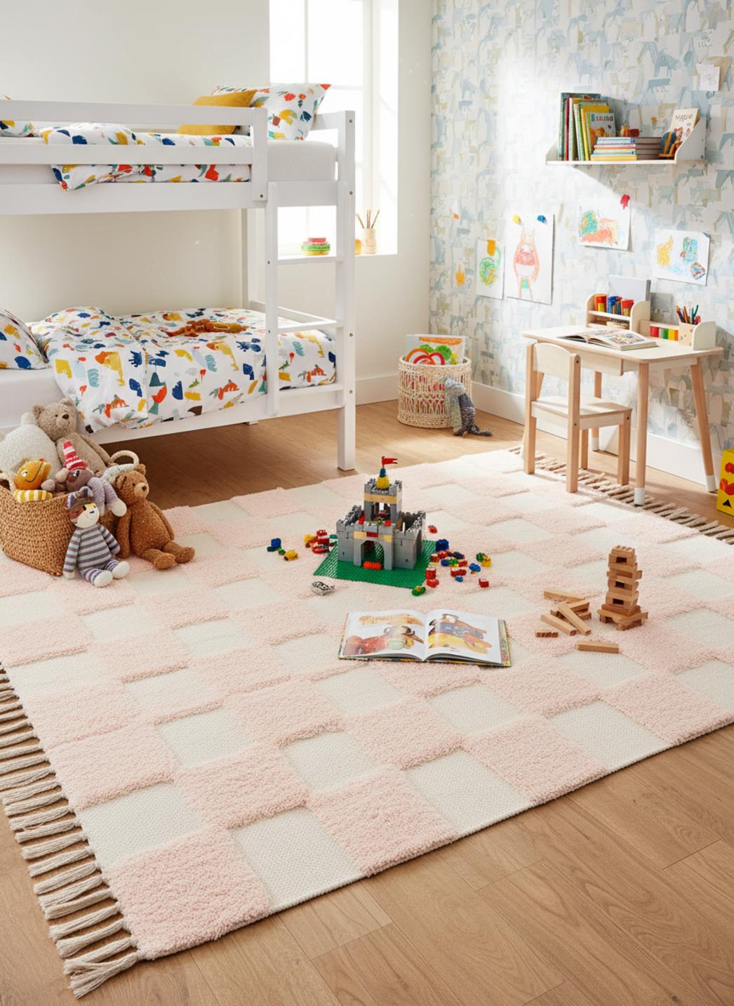 La palette douce, mêlant une nuance tendre de rose et un blanc lumineux blanc, invite aux routines du soir où l’on lit ensemble, à la lumière chaude d’une lampe, pendant que le tapis absorbe les petits bruits et crée une bulle de calme. Son motif aide à délimiter un coin lecture et un espace jeu pour organiser naturellement les moments de la journée.