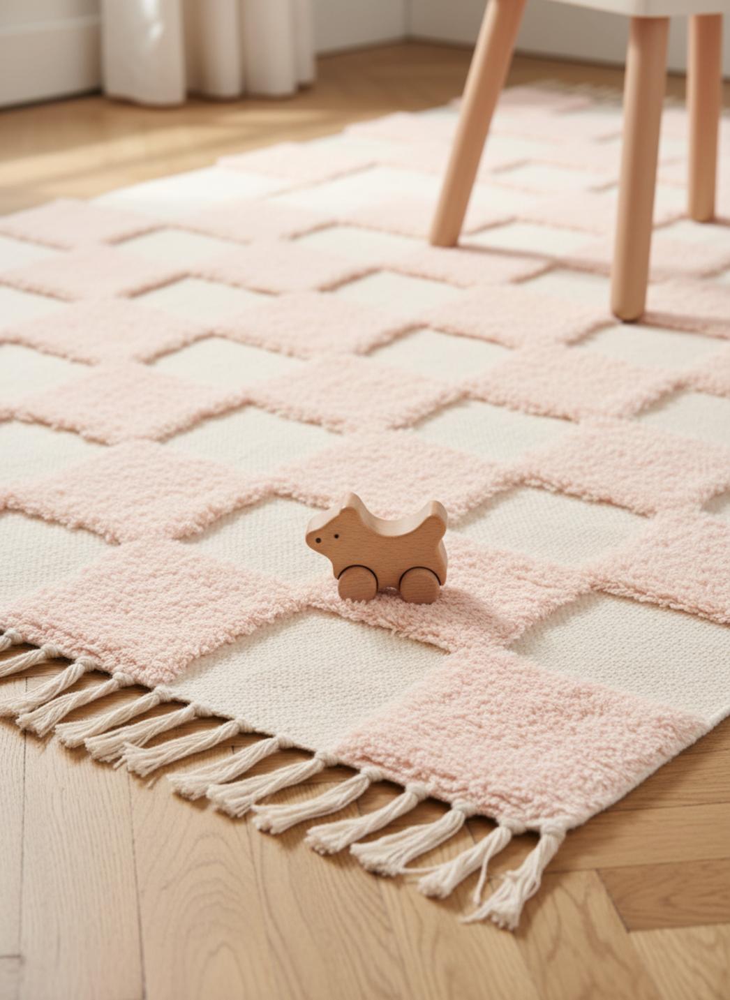 Tapis géométrique damier épais enfant rose et blanc en coton 80x120 cm