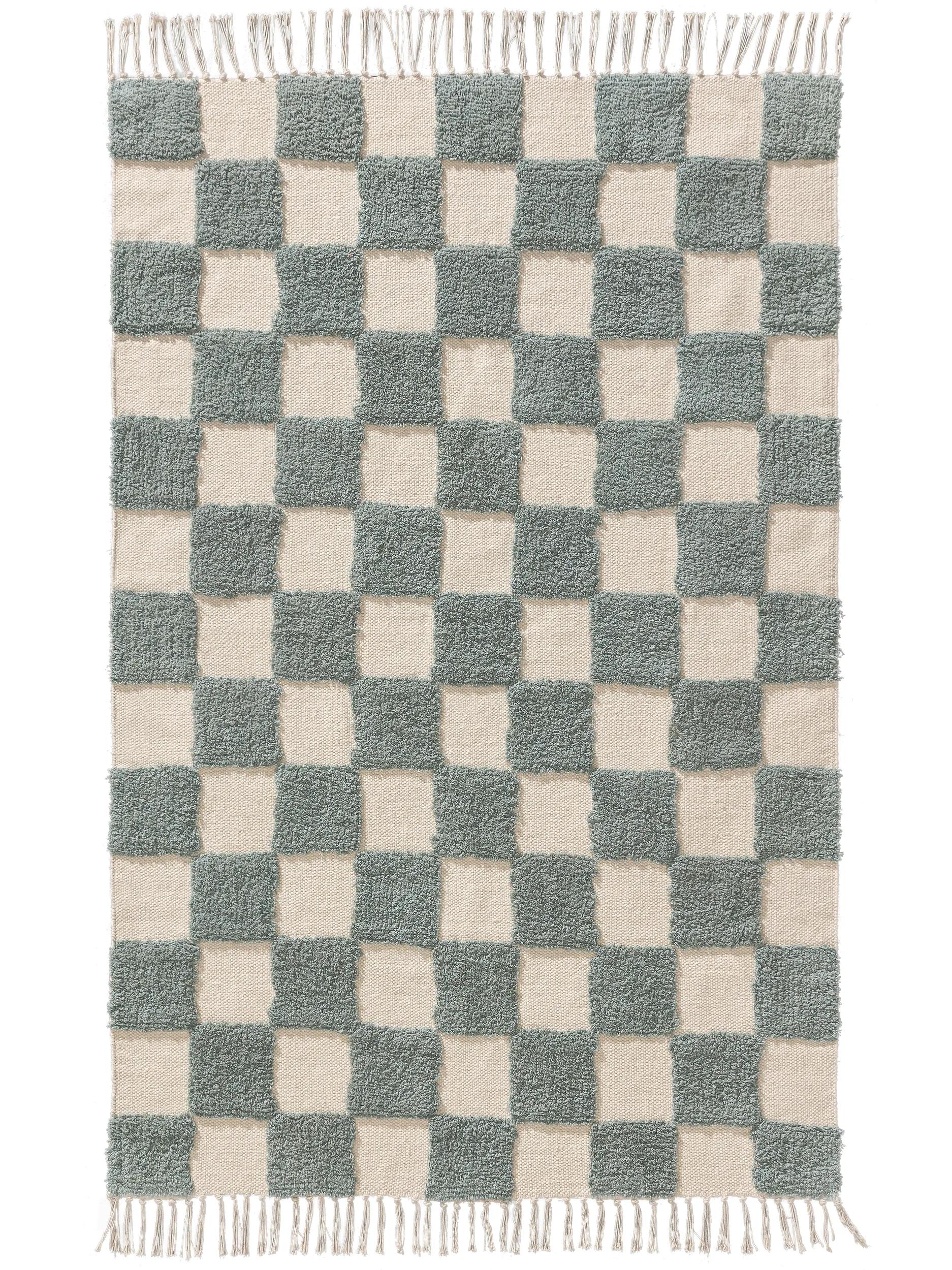 Tapis géométrique damier épais enfant vert d'eau et beige en coton 160x230 cm