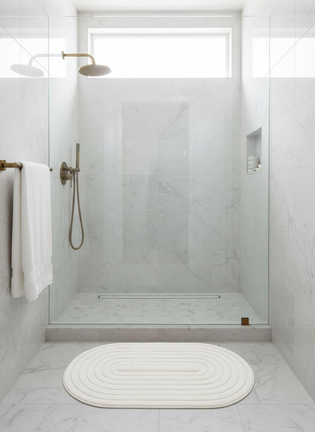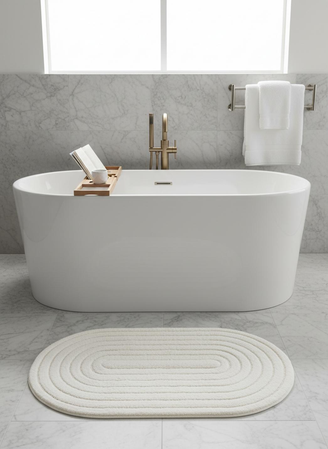 Son format compact structure l'espace devant la vasque ou à la sortie de la douche, proposant un point d'ancrage discret mais déterminant. Le 50x80 cm s'intègre comme un rectangle d'équilibre, soulignant la ligne du mobilier et guidant le regard le long du sol.