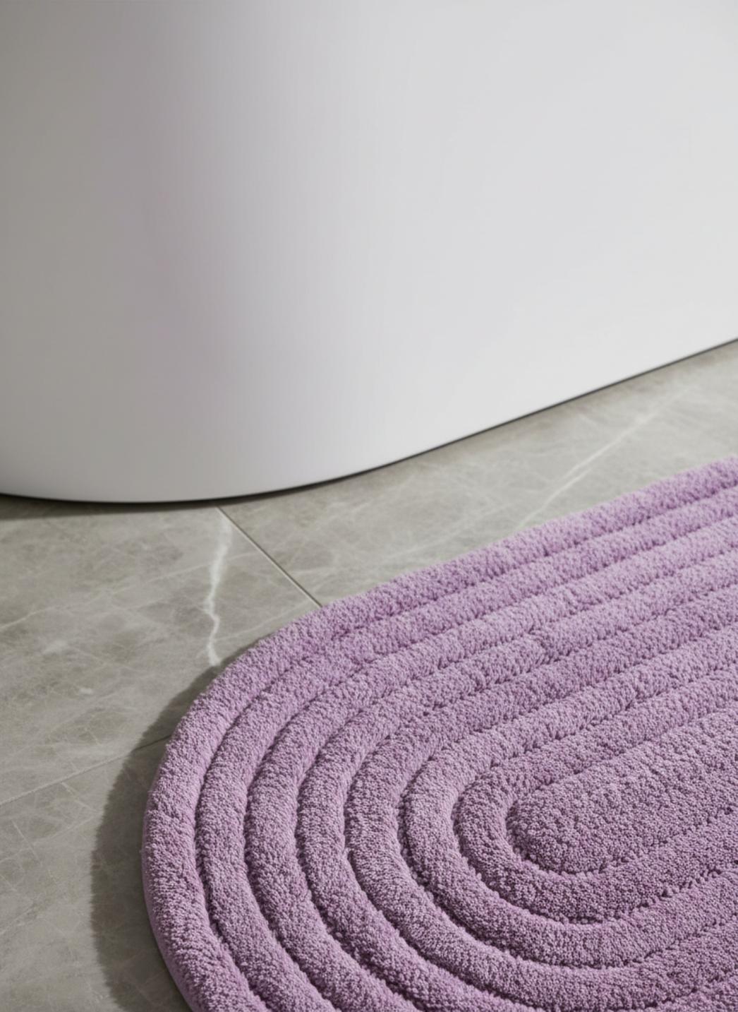Sous les pas, la matière en coton se fait tactile et accueillante, légèrement moelleuse et naturellement absorbante. La densité du tissage propose un confort instantané et un contact rassurant après la douche. Le toucher évoque une finition artisanale contemporaine, où la douceur se marie à la précision du motif pour composer une présence discrète mais affirmée.