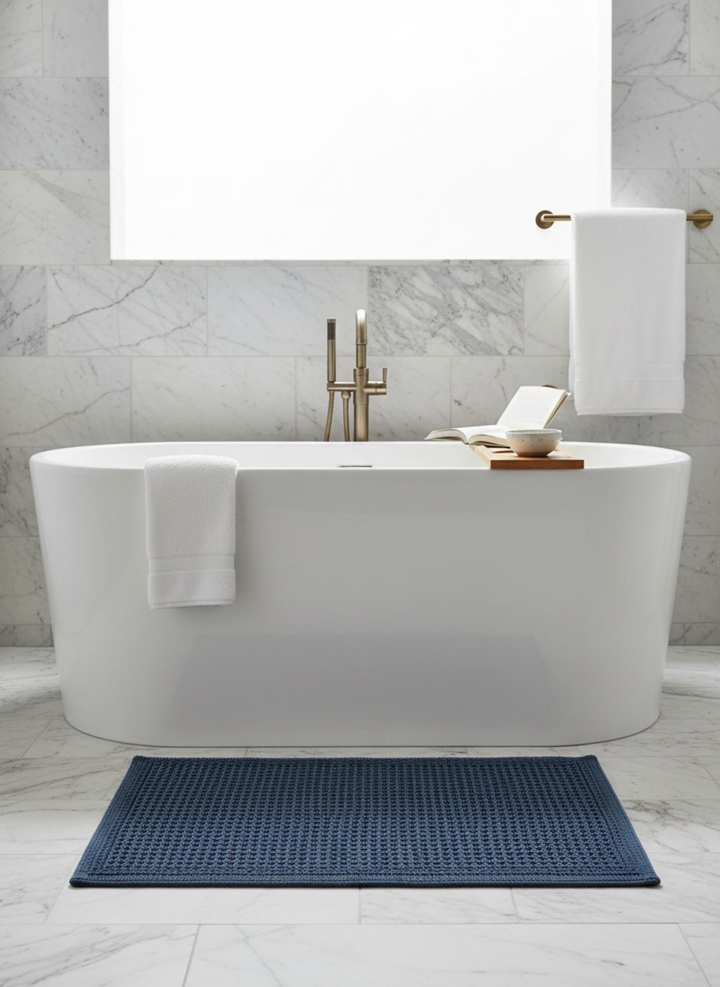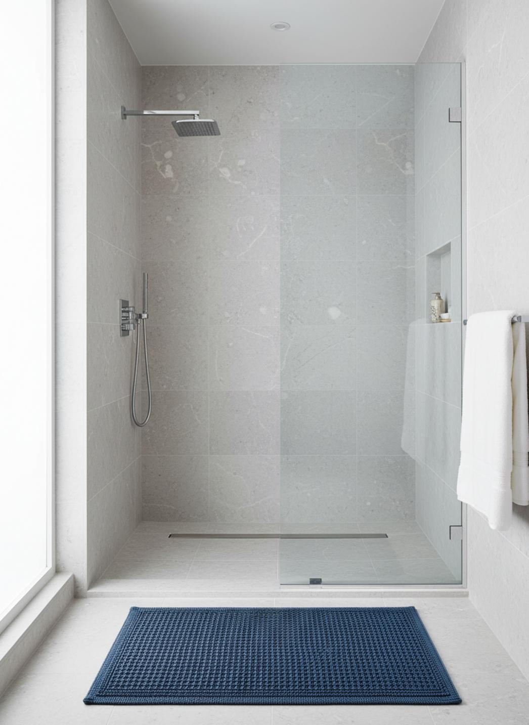 Sa présence, mesurée et pensée pour des dimensions précises, transforme la circulation. Le format 50x80 cm crée un axe devant une vasque ou le long d’une baignoire, soulignant le mobilier sans le dominer. Posé perpendiculairement à un meuble bas, il élargit la perception du sol et guide l’oeil vers les volumes de la pièce. L’échelle du tapis invite à un dialogue discret entre les objets et la géométrie ambiante, tout en proposant un point d’ancrage fonctionnel.