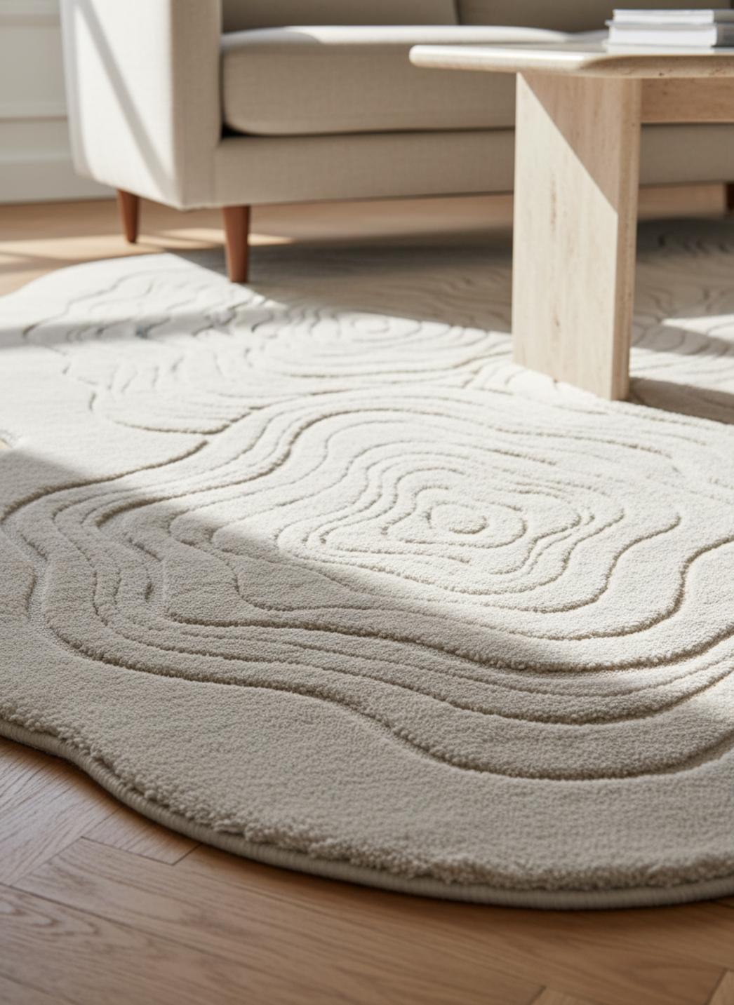 On reconnaît ici des formes simples — blocs, lignes et angles — qui dialoguent avec des espaces négatifs pour composer un rythme régulier. Le motif conserve une élégance minimaliste, qui peut se mêler à un décor en bois clair ou à des tissus plus profonds. Au toucher, la matière montre sa présence sans être envahissante : elle restitue une sensation dense sous la plante du pied, encourageant la pause et l'usage quotidien.