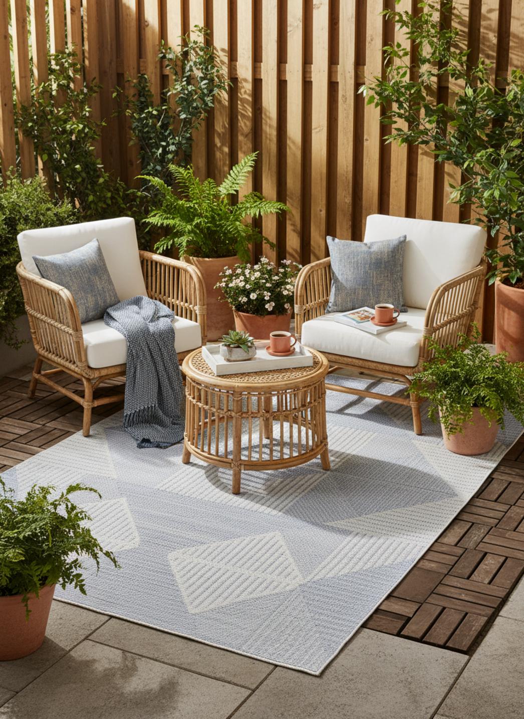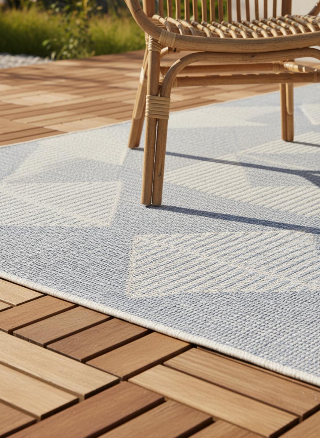 Ce tapis géométrique d’inspiration ethnique en gris et bleu apporte une note subtile de caractère aux petits espaces extérieurs. Dans son format de 80x150 cm, il se glisse avec élégance sur un balcon, le long d’une allée ou devant un fauteuil de détente. Le gris, doux et équilibré, évoque la minéralité des sols en pierre, tandis que le bleu insuffle une fraîcheur apaisante rappelant la mer ou le ciel d’été. Les motifs géométriques, inspirés des dessins traditionnels, créent une dynamique visuelle harmonieuse où structure et légèreté se rencontrent. Ce tapis d’extérieur redéfinit l’espace avec simplicité, apportant rythme et profondeur sans surcharge. Il s’accorde parfaitement à des matériaux naturels comme le bois clair, le rotin ou la corde tressée, tout en ajoutant une touche contemporaine. Sa présence discrète mais affirmée invite à la détente et à la contemplation, transformant chaque coin de terrasse en un lieu à la fois raffiné et apaisant.
