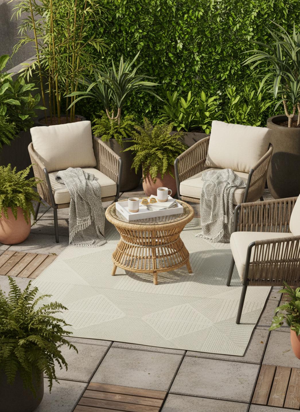 Avec son allure raffinée et son charme discret, ce tapis géométrique à inspiration ethnique gris et vert apporte une note de caractère apaisée aux espaces extérieurs. Ses motifs, à mi-chemin entre tradition et modernité, dessinent une trame équilibrée où la géométrie rencontre la douceur des tons naturels. Sur un balcon, une terrasse urbaine ou près d’un fauteuil en rotin, il structure le sol tout en diffusant une atmosphère calme et contemporaine. Le gris, sobre et minéral, s’allie au vert doux pour rappeler la pierre et la végétation, une association parfaite pour créer un lien entre nature et design. Ce tapis d’extérieur de 80x150 cm se glisse aisément dans les petits espaces, apportant texture et profondeur sans les alourdir. Ses lignes délicates rythment le décor, guidant le regard et invitant à la détente. À la lumière du jour, les nuances se fondent avec élégance, révélant des reflets subtils et des contrastes feutrés. En fin de journée, elles s’adoucissent pour envelopper la terrasse d’une douceur visuelle apaisante. Ce tapis gris et vert incarne l’équilibre parfait entre la rigueur du motif géométrique et la sensibilité du style ethnique, une pièce qui allie naturel, sobriété et authenticité dans une harmonie simple et essentielle.