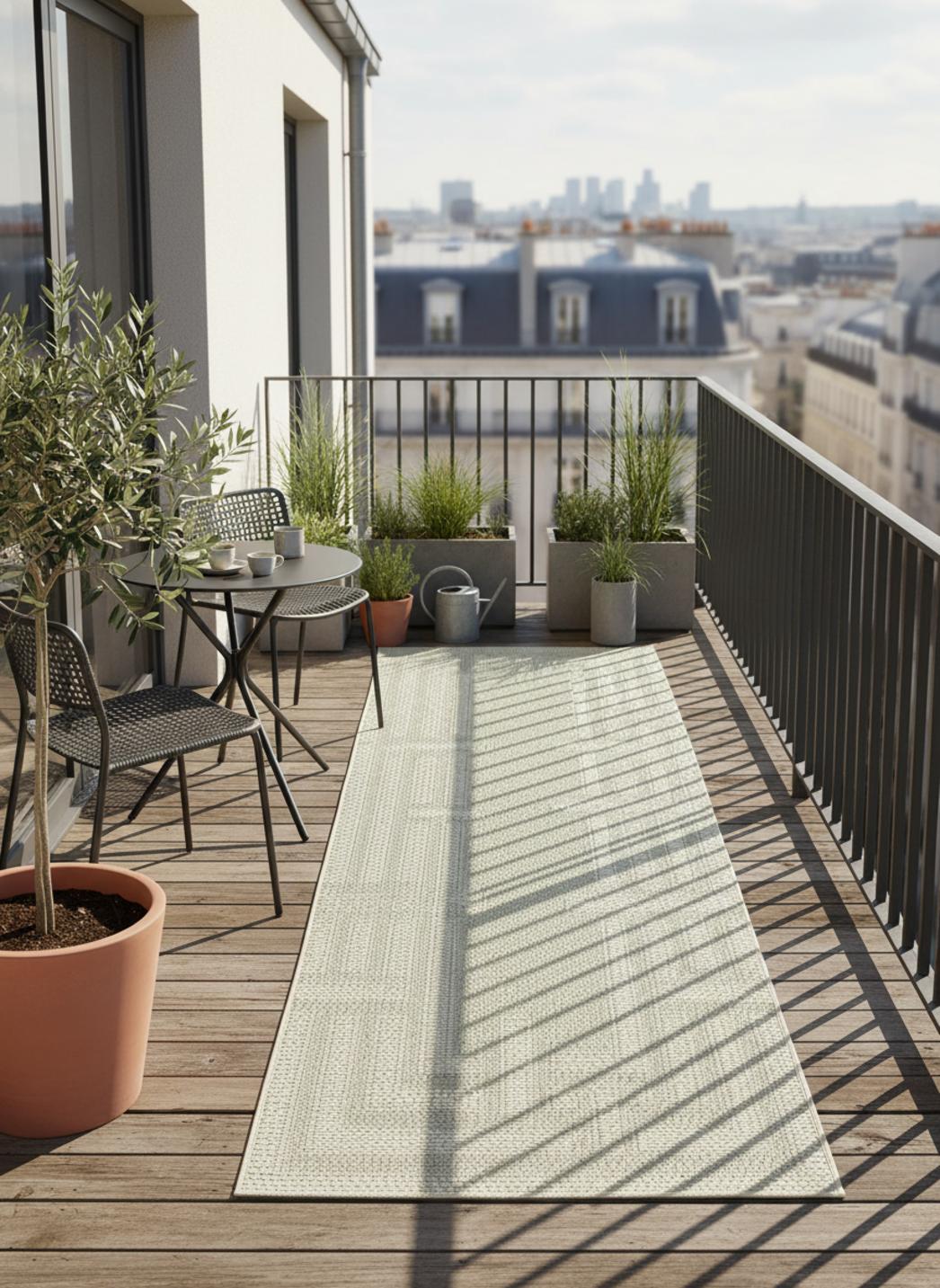 Le long d’un passage ou sur un balcon moderne, le tapis géométrique labyrinthe vert et gris apporte une note contemporaine et structurée à l’espace. Son motif entrelacé, inspiré des formes architecturales, guide le regard avec fluidité et crée une impression de profondeur élégante. Les tons verts et gris s’équilibrent harmonieusement : le vert apporte une fraîcheur végétale, tandis que le gris adoucit l’ensemble d’une touche minérale. En format 80x250 cm, il souligne la circulation tout en reliant naturellement les espaces de vie. Ce modèle illustre la modernité raffinée de la sélection de tapis d’extérieur, où la géométrie et la couleur dialoguent avec la lumière pour créer des décors équilibrés. Sa texture tissée à plat révèle un relief discret qui anime la surface sans rompre la continuité du motif. On retrouve cette même sensation de fluidité et d’harmonie dans la gamme de tapis de balcon, parfaite pour prolonger la fraîcheur et la modernité jusque dans les espaces étroits. Un tapis qui allie structure, mouvement et sérénité pour accompagner chaque pas avec élégance.