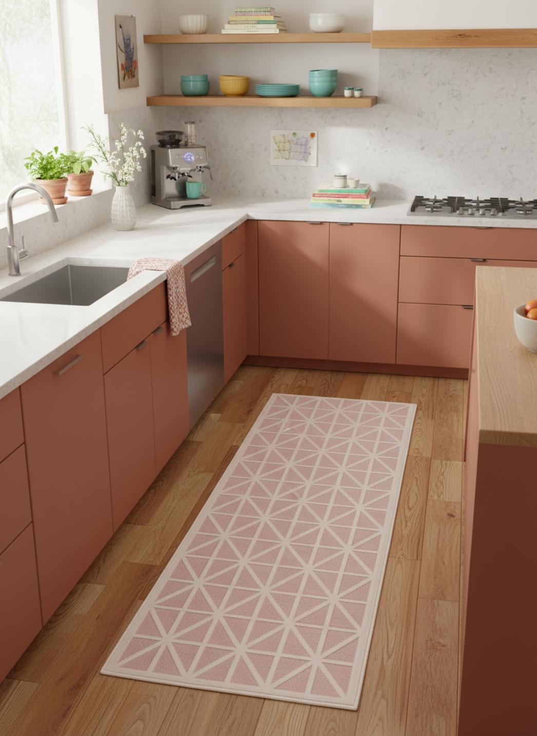 Ce tapis géométrique de couloir à motif losange rose clair apporte une touche de fraîcheur et de raffinement aux espaces extérieurs. Sur 80x250 cm, ses lignes fines s’étirent dans une composition fluide qui guide le regard et allonge visuellement l’espace. La géométrie du motif crée un équilibre subtil entre ordre et légèreté, tandis que la teinte rose clair diffuse une lumière douce et apaisante. À la clarté du jour, ses reflets poudrés révèlent toute la délicatesse du tissage, évoquant la douceur d’une brise estivale sur une terrasse ensoleillée. Ce tapis de couloir d’intérieur et d’extérieur allie modernité et élégance naturelle, structurant le passage tout en y insufflant chaleur et sérénité. Il transforme chaque allée en un trait de lumière, à la fois sobre, harmonieux et plein de charme.