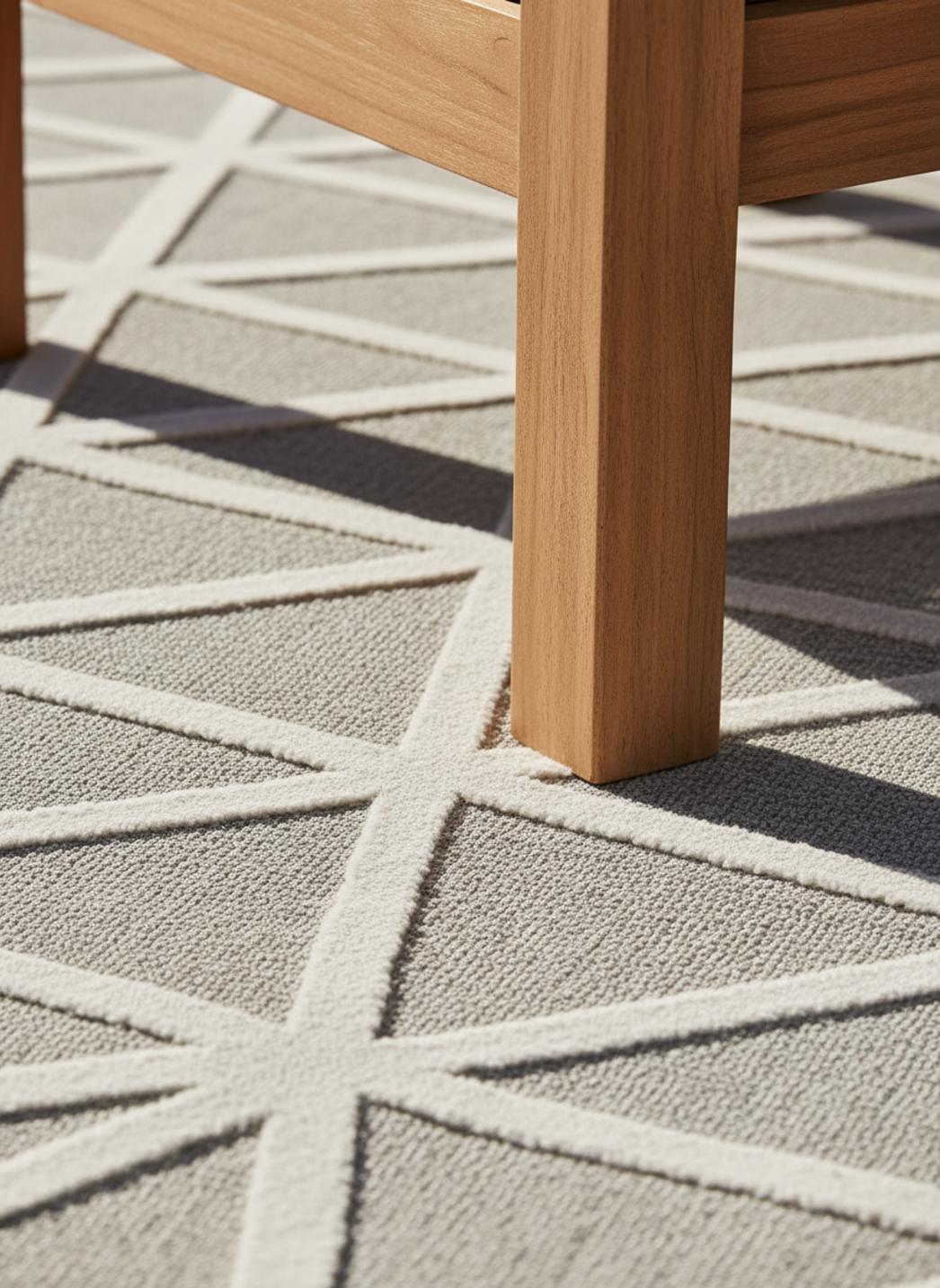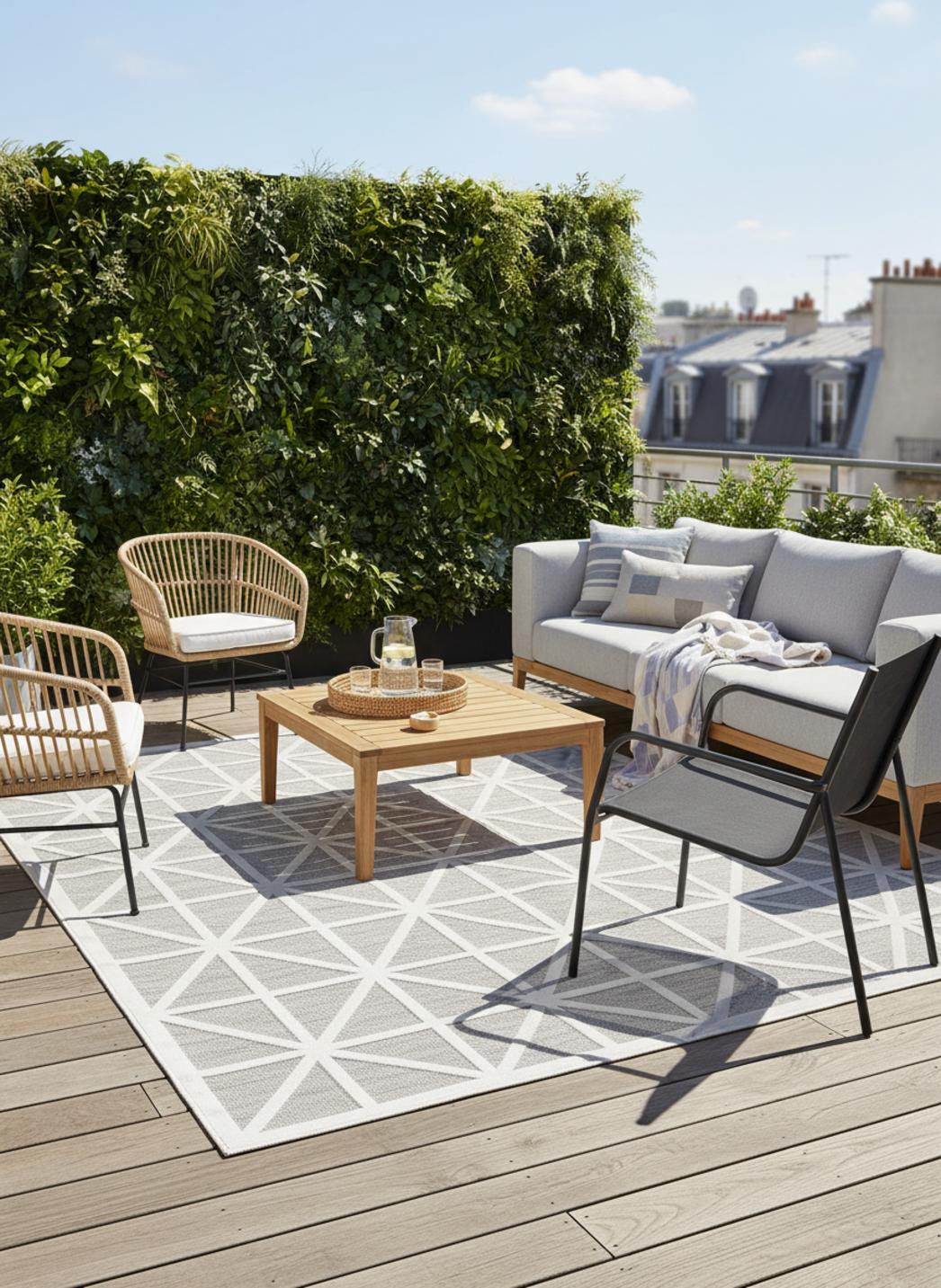 Pensé pour s’insérer facilement, le tapis dialogue avec l’usage, qu’il soit pour un salon chaleureux ou une terrasse abritée. Sa capacité à fonctionner en intérieur comme en extérieur transforme la pièce en un plateau scénographique où mobilier et lumière trouvent un équilibre. L’objet structure la circulation et définit un coin de vie sans gesticuler.