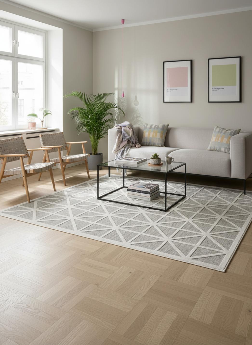 Une toile au sol devient un véritable dispositif visuel, où le motif géométrique impose son tempo sans écraser l’espace. Les losange reprennent la cadence, alternant pleins et vides pour créer une trame qui capte la lumière et invite au pas posé. La grisaille y devient matière, sculpte les volumes et donne au regard un chemin agréable.