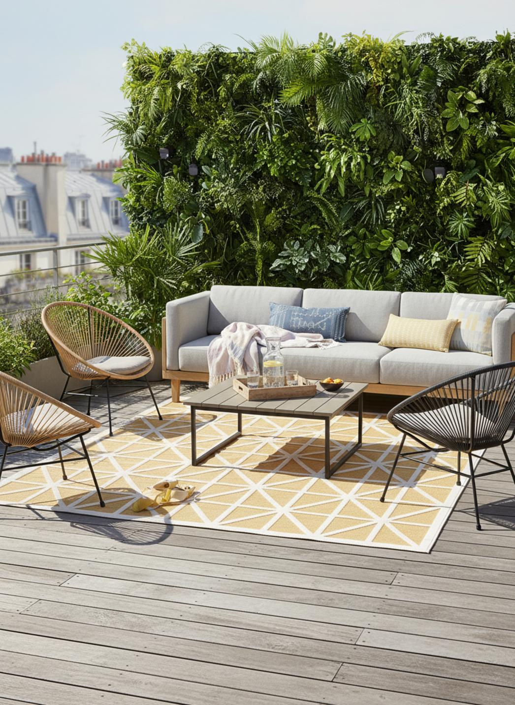 Grâce à sa taille contenue de 120x170 cm, l’ensemble devient un point d’ancrage discret qui affirme la composition d’une pièce. Posé en intérieur, il souligne un coin salon ou vient encadrer un fauteuil. Installé en extérieur, il définit un salon de terrasse tout en apportant une note chaleureuse et accueillante. La proportion choisie donne à la fois équilibre et liberté pour réarranger les éléments autour.