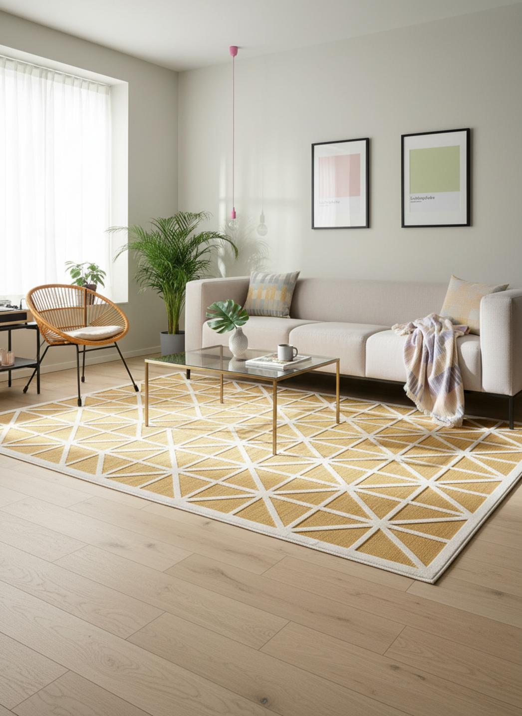 Au cœur du dessin, la répétition de losanges crée un tempo visuel. Les axes verticaux et obliques instaurent une cadence qui allonge la perspective et dynamise les volumes bas du mobilier. Le contraste entre matières mates et zones plus légères amplifie le relief des motifs. L’espace gagne ainsi en profondeur et en mouvement, sans perdre cette élégance graphique qui reste apaisante.