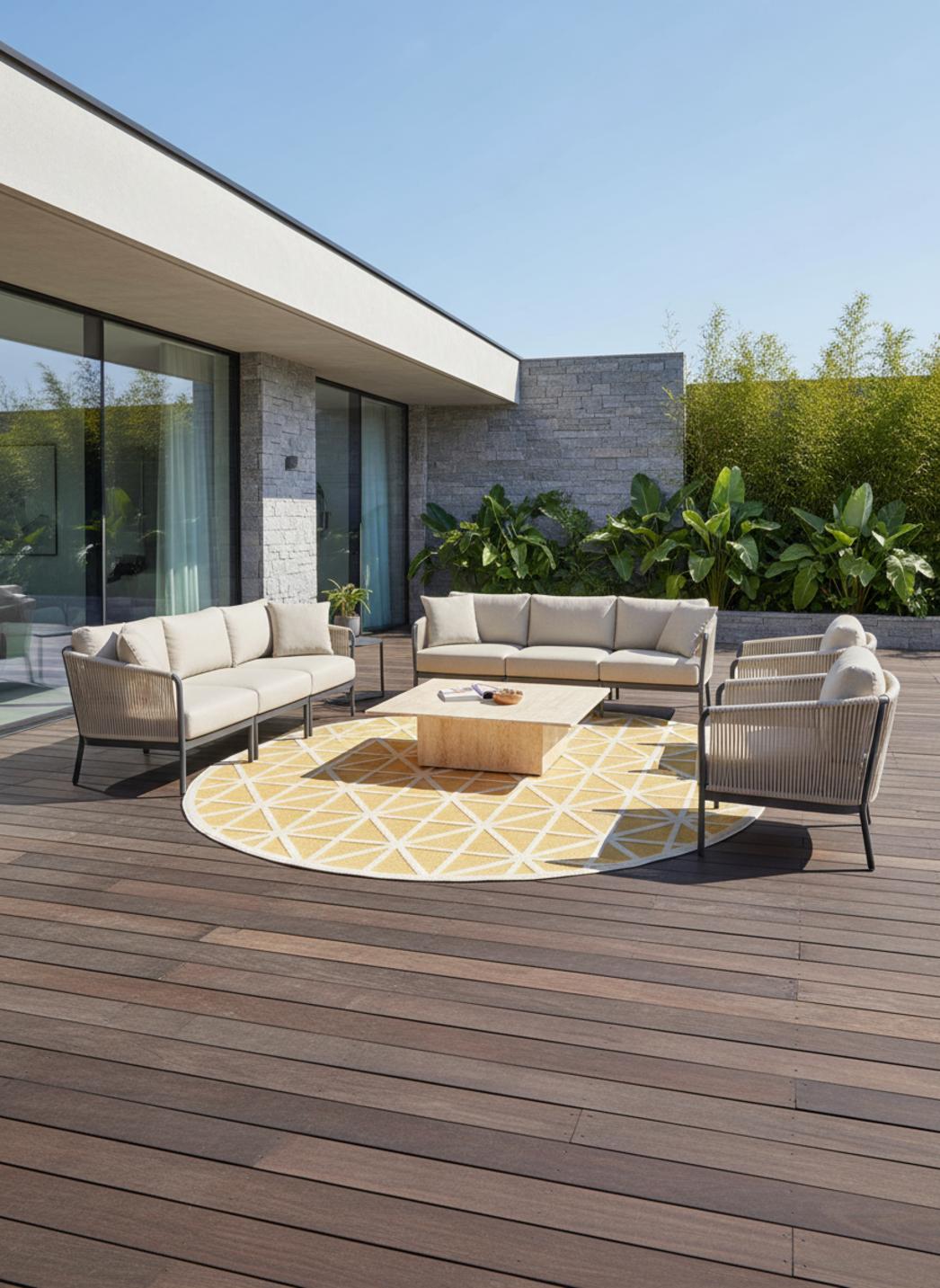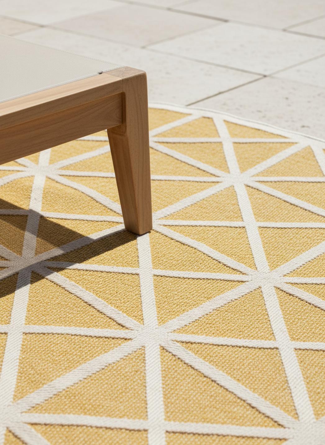 Pensé pour accompagner des usages variés, ce modèle s’intègre aussi bien en intérieur qu’en extérieur, sans renoncer à l’élégance graphique. La construction ménage un toucher accueillant sous les pieds et une tenue qui conserve la géométrie du motif. L’absence d’effet superflu laisse la couleur et la forme s’exprimer, rendant l’entretien discret et la présence durable.