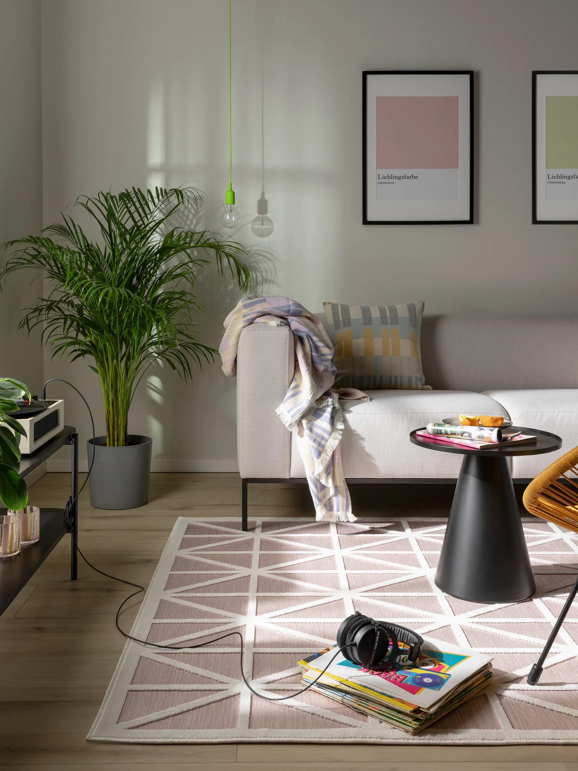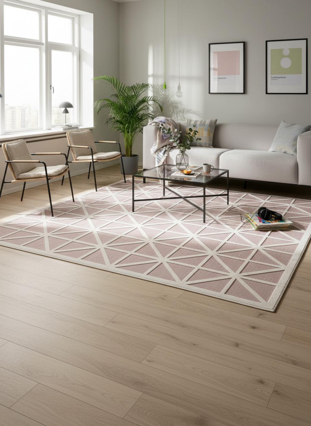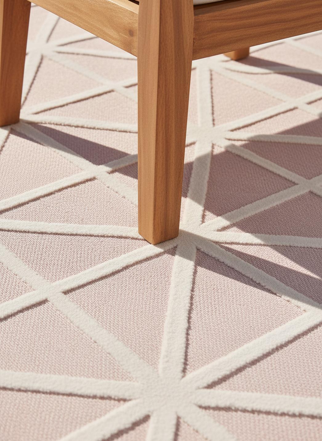 Dans une chambre ou un salon scandinave, la palette rose clair s'inscrit comme une touche sophistiquée qui adoucit les lignes minimalistes. L'effet cocon des formes géométriques et le dessin en losange réinventent la perspective, invitant au mouvement et à la pause, à la fois stimulant et apaisant.