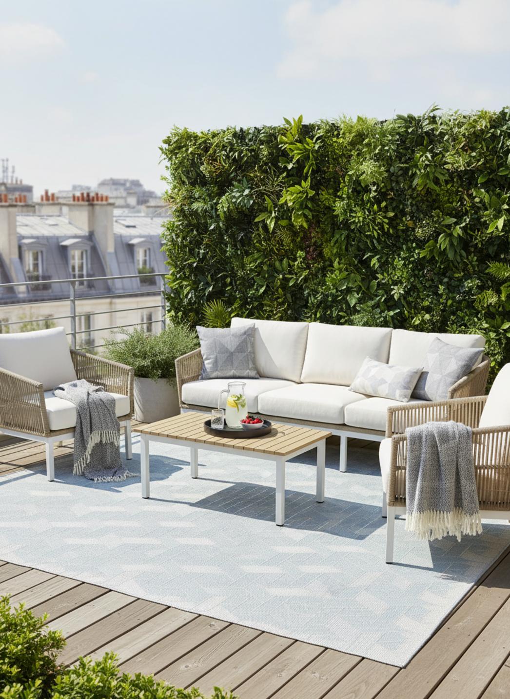 Son caractère polyvalent transforme l’atmosphère selon le contexte : posé sur un parquet clair, il évoque une ambiance scandinave apaisée ; installé sur des dalles extérieures, il tempère l’espace et invite au rassemblement. Il dialogue avec les matières naturelles et les métaux, amplifiant la sensation de profondeur et donnant une allure structurée à la pièce, tout en restant chaleureuse sous les pas.