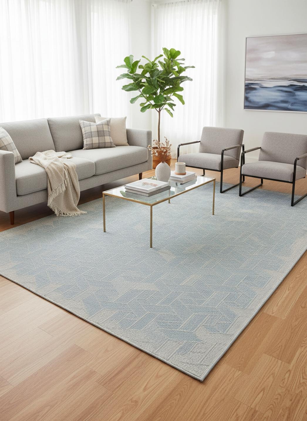 Imaginez une surface qui joue avec la lumière comme une sculpture au sol, où le motif géométrique se déploie en volumes apparents. Les facettes se chevauchent et soulignent un effet 3d subtil, évoquant un maillage de prismes bleutés. Le bleu module la profondeur sans agressivité, alternant tons clairs et ombres pour créer un rythme visuel à la fois serein et vivant.